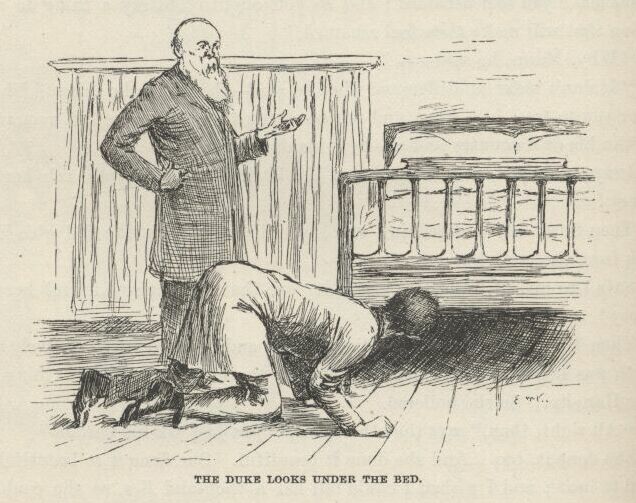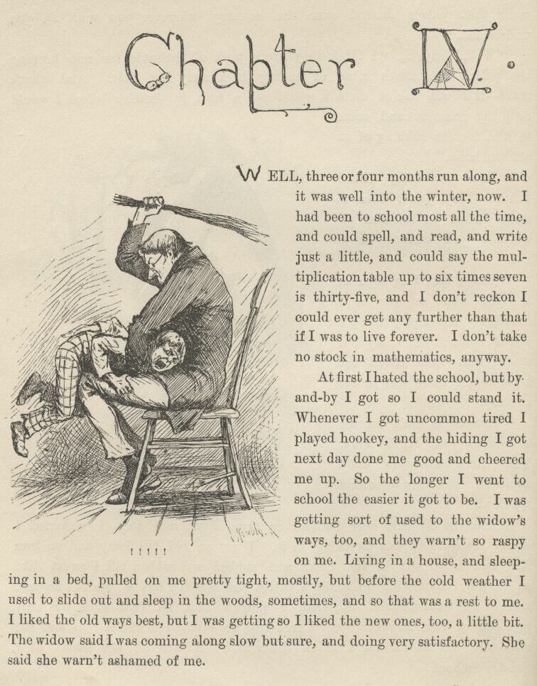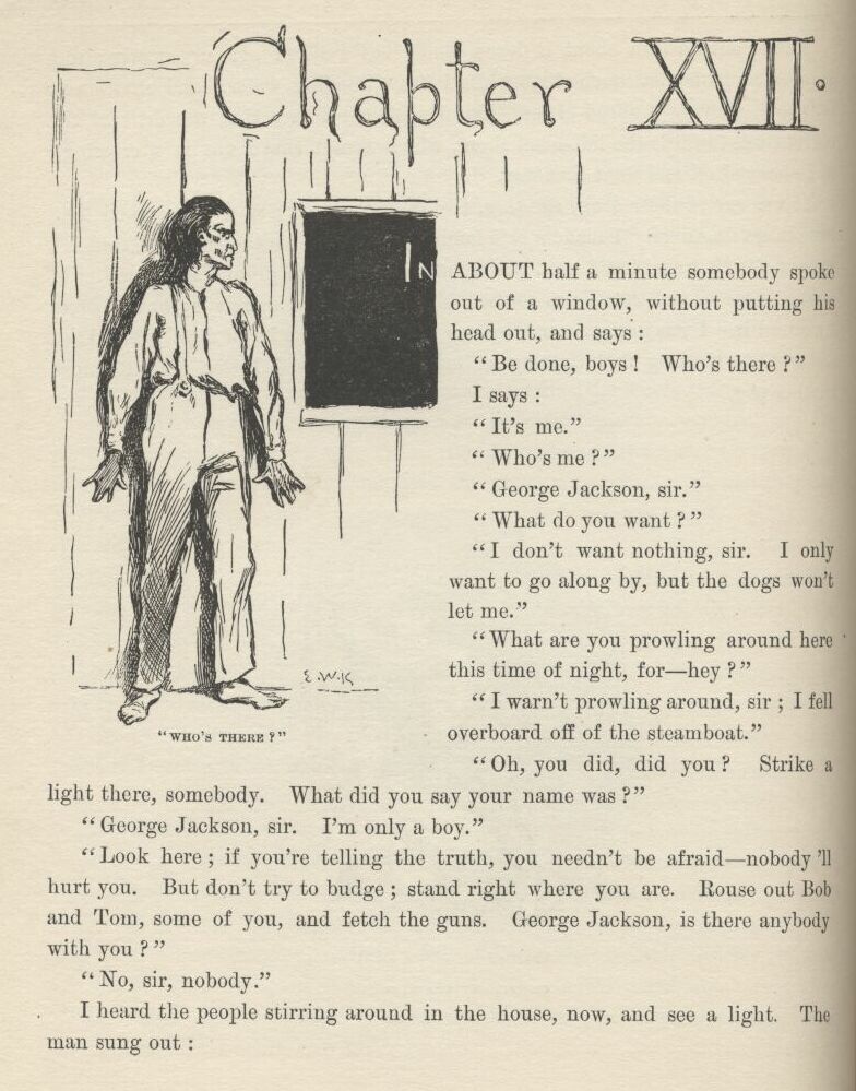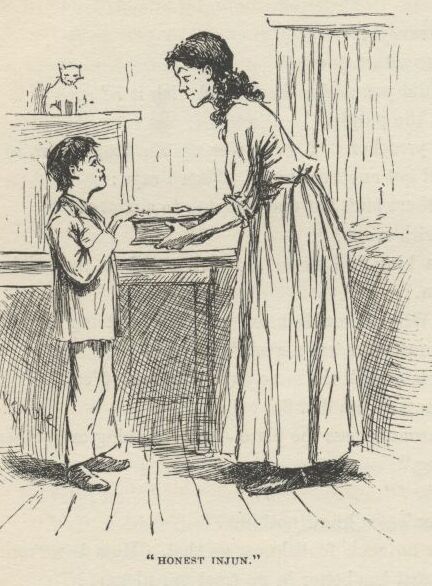 “You mean where’s Huck Finn—that’s what you mean! I reckon I hain’t raised such a scamp as my Tom all these years not to know him when I see him. That would be a pretty howdy-do. Come out from under that bed, Huck Finn.”