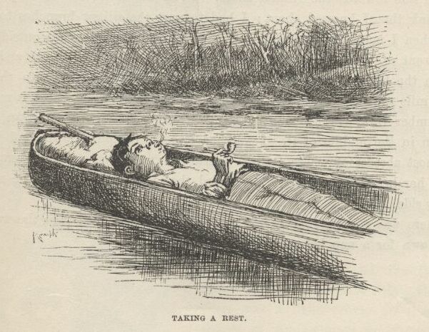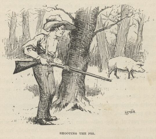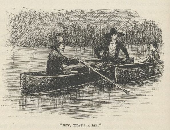 “—and load up the cabin with rats and snakes and so on, for company for Jim; and then you kept Tom here so long with the butter in his hat that you come near spiling the whole business, because the men come before we was out of the cabin, and we had to rush, and they heard us and let drive at us, and I got my share, and we dodged out of the path and let them go by, and when the dogs come they warn’t interested in us, but went for the most noise, and we got our canoe, and made for the raft, and was all safe, and Jim was a free man, and we done it all by ourselves, and wasn’t it bully, Aunty!”
