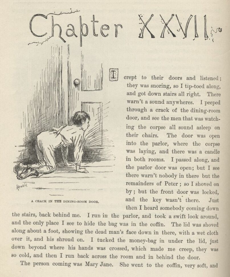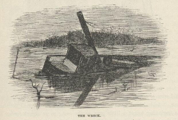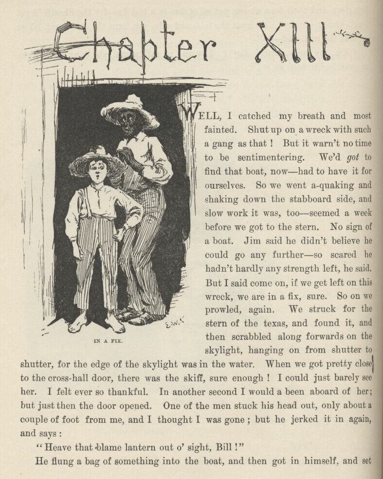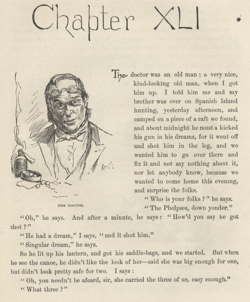 Then they come out and locked him up. I hoped they was going to say he could have one or two of the chains took off, because they was rotten heavy, or could have meat and greens with his bread and water; but they didn’t think of it, and I reckoned it warn’t best for me to mix in, but I judged I’d get the doctor’s yarn to Aunt Sally somehow or other as soon as I’d got through the breakers that was laying just ahead of me—explanations, I mean, of how I forgot to mention about Sid being shot when I was telling how him and me put in that dratted night paddling around hunting the runaway nigger.