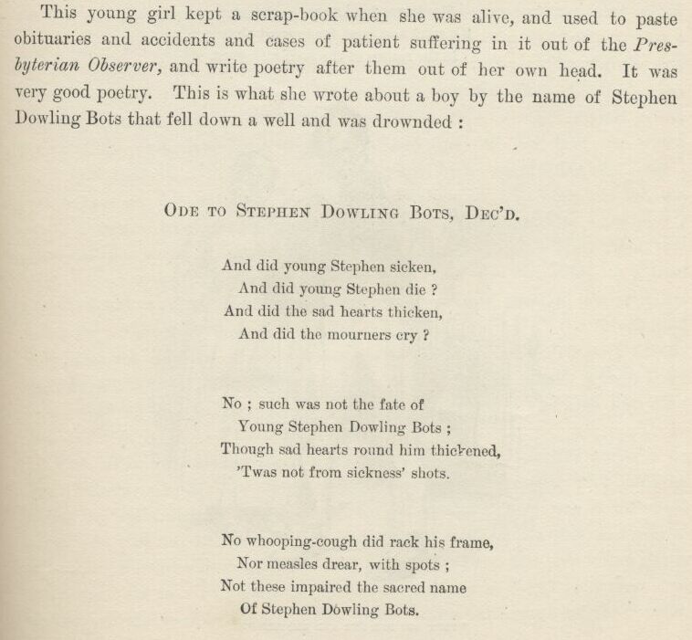 I wanted to offer to bet two dollars she hadn’t, but I reckoned maybe it was just as safe to not to. So I never said nothing.