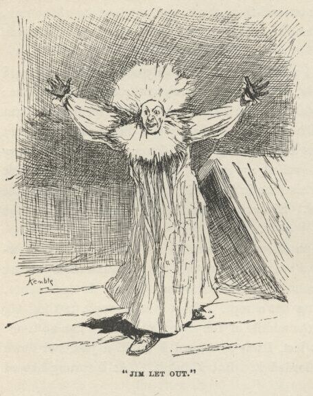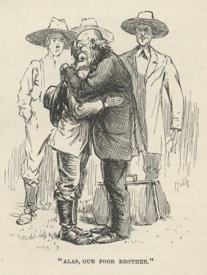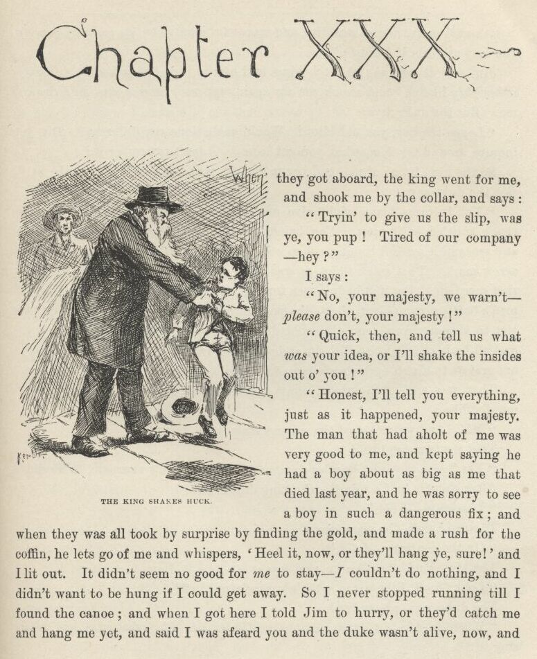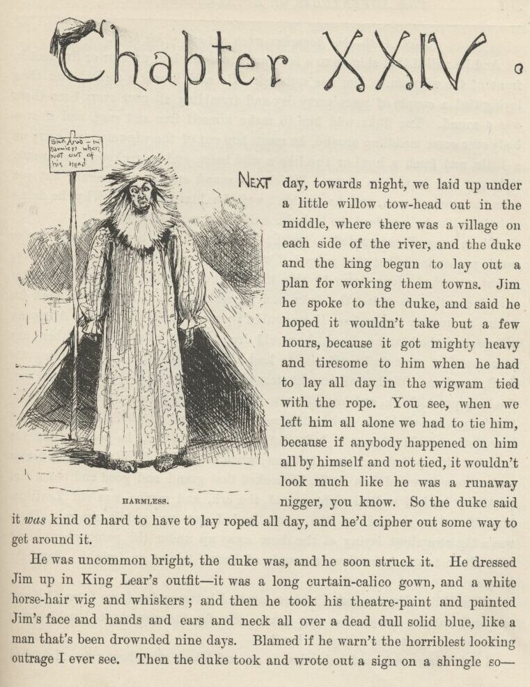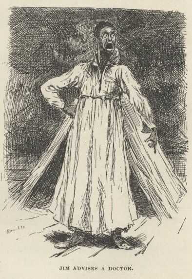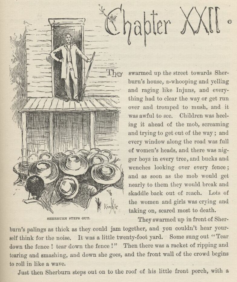 I followed the men to see what they was going to do with Jim; and the old doctor and Uncle Silas followed after Tom into the house. The men was very huffy, and some of them wanted to hang Jim for an example to all the other niggers around there, so they wouldn’t be trying to run away like Jim done, and making such a raft of trouble, and keeping a whole family scared most to death for days and nights. But the others said, don’t do it, it wouldn’t answer at all; he ain’t our nigger, and his owner would turn up and make us pay for him, sure. So that cooled them down a little, because the people that’s always the most anxious for to hang a nigger that hain’t done just right is always the very ones that ain’t the most anxious to pay for him when they’ve got their satisfaction out of him.