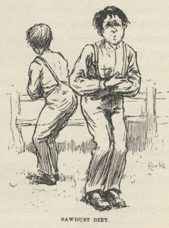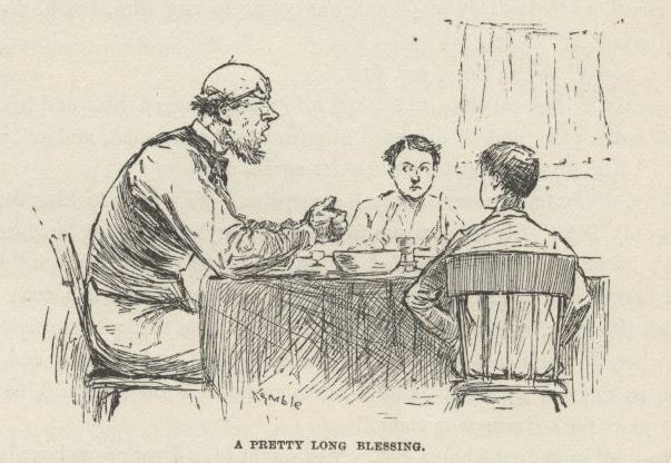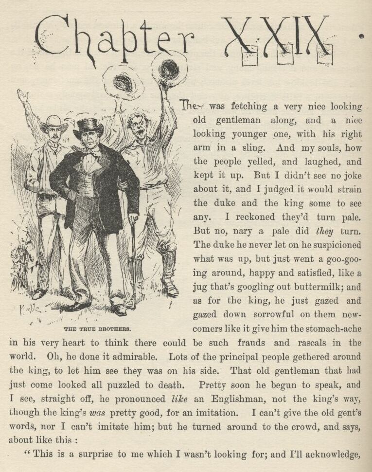Aunt Sally she was one of the mixed-upest-looking persons I ever see—except one, and that was Uncle Silas, when he come in and they told it all to him. It kind of made him drunk, as you may say, and he didn’t know nothing at all the rest of the day, and preached a prayer-meeting sermon that night that gave him a rattling ruputation, because the oldest man in the world couldn’t a understood it. So Tom’s Aunt Polly, she told all about who I was, and what; and I had to up and tell how I was in such a tight place that when Mrs. Phelps took me for Tom Sawyer—she chipped in and says, “Oh, go on and call me Aunt Sally, I’m used to it now, and ’tain’t no need to change”—that when Aunt Sally took me for Tom Sawyer I had to stand it—there warn’t no other way, and I knowed he wouldn’t mind, because it would be nuts for him, being a mystery, and he’d make an adventure out of it, and be perfectly satisfied. And so it turned out, and he let on to be Sid, and made things as soft as he could for me.