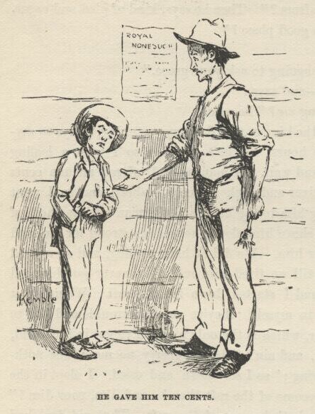 “Doan’ you ’member de house dat was float’n down de river, en dey wuz a man in dah, kivered up, en I went in en unkivered him and didn’ let you come in? Well, den, you kin git yo’ money when you wants it, kase dat wuz him.”