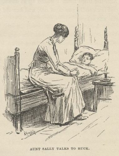 And then when I went up to bed she come up with me and fetched her candle, and tucked me in, and mothered me so good I felt mean, and like I couldn’t look her in the face; and she set down on the bed and talked with me a long time, and said what a splendid boy Sid was, and didn’t seem to want to ever stop talking about him; and kept asking me every now and then if I reckoned he could a got lost, or hurt, or maybe drownded, and might be laying at this minute somewheres suffering or dead, and she not by him to help him, and so the tears would drip down silent, and I would tell her that Sid was all right, and would be home in the morning, sure; and she would squeeze my hand, or maybe kiss me, and tell me to say it again, and keep on saying it, because it done her good, and she was in so much trouble. And when she was going away she looked down in my eyes so steady and gentle, and says: