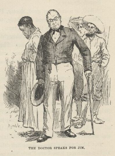 “Don’t be no rougher on him than you’re obleeged to, because he ain’t a bad nigger. When I got to where I found the boy I see I couldn’t cut the bullet out without some help, and he warn’t in no condition for me to leave to go and get help; and he got a little worse and a little worse, and after a long time he went out of his head, and wouldn’t let me come a-nigh him any more, and said if I chalked his raft he’d kill me, and no end of wild foolishness like that, and I see I couldn’t do anything at all with him; so I says, I got to have help somehow; and the minute I says it out crawls this nigger from somewheres and says he’ll help, and he done it, too, and done it very well. Of course I judged he must be a runaway nigger, and there I was! and there I had to stick right straight along all the rest of the day and all night. It was a fix, I tell you! I had a couple of patients with the chills, and of course I’d of liked to run up to town and see them, but I dasn’t, because the nigger might get away, and then I’d be to blame; and yet never a skiff come close enough for me to hail. So there I had to stick plumb until daylight this morning; and I never see a nigger that was a better nuss or faithfuller, and yet he was risking his freedom to do it, and was all tired out, too, and I see plain enough he’d been worked main hard lately. I liked the nigger for that; I tell you, gentlemen, a nigger like that is worth a thousand dollars—and kind treatment, too. I had everything I needed, and the boy was doing as well there as he would a done at home—better, maybe, because it was so quiet; but there I was, with both of ’m on my hands, and there I had to stick till about dawn this morning; then some men in a skiff come by, and as good luck would have it the nigger was setting by the pallet with his head propped on his knees sound asleep; so I motioned them in quiet, and they slipped up on him and grabbed him and tied him before he knowed what he was about, and we never had no trouble. And the boy being in a kind of a flighty sleep, too, we muffled the oars and hitched the raft on, and towed her over very nice and quiet, and the nigger never made the least row nor said a word from the start. He ain’t no bad nigger, gentlemen; that’s what I think about him.”