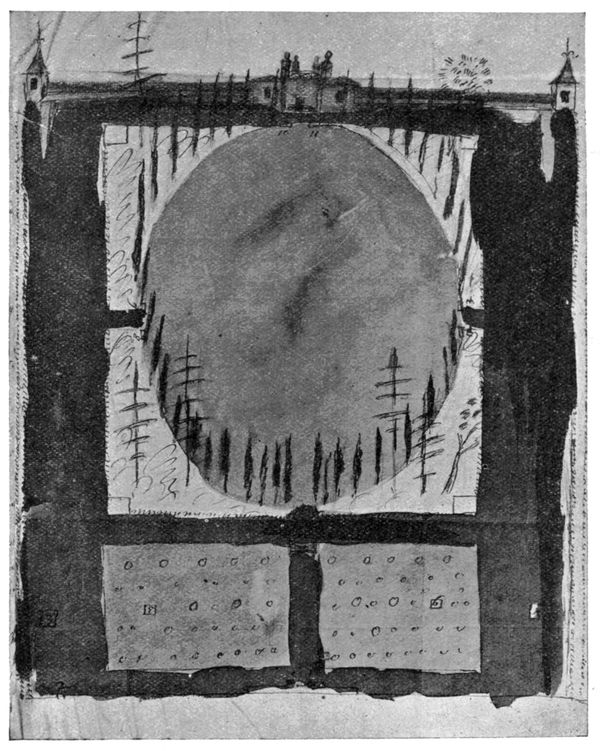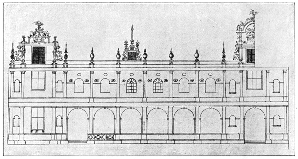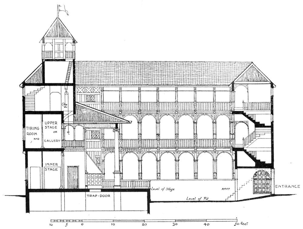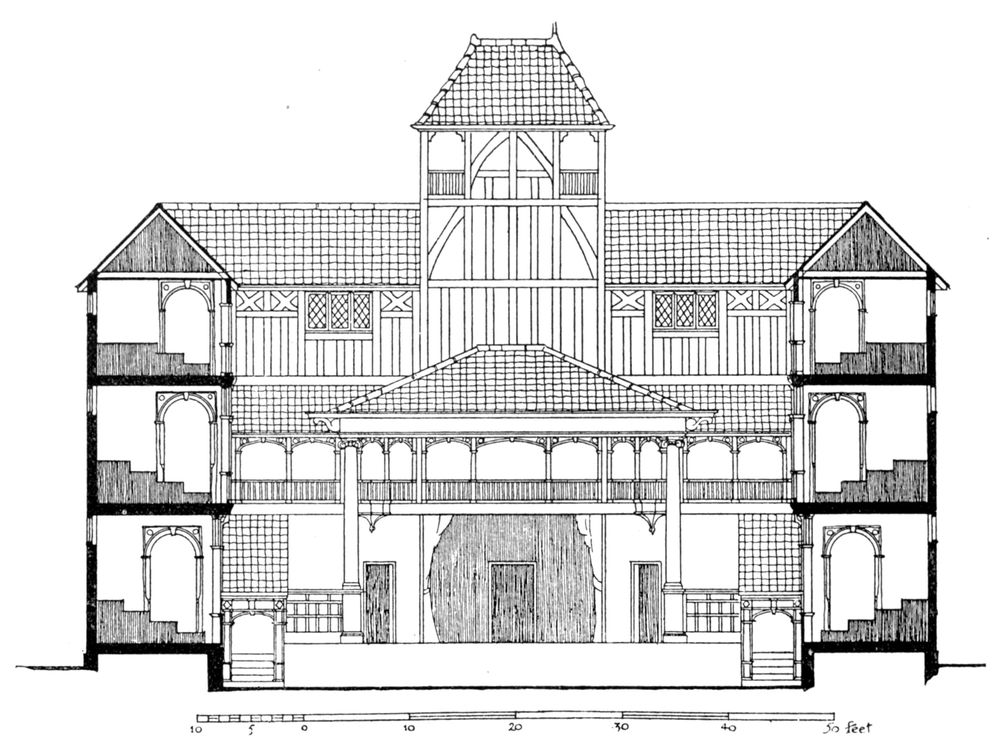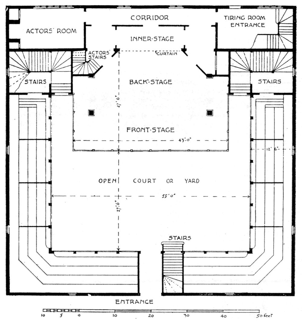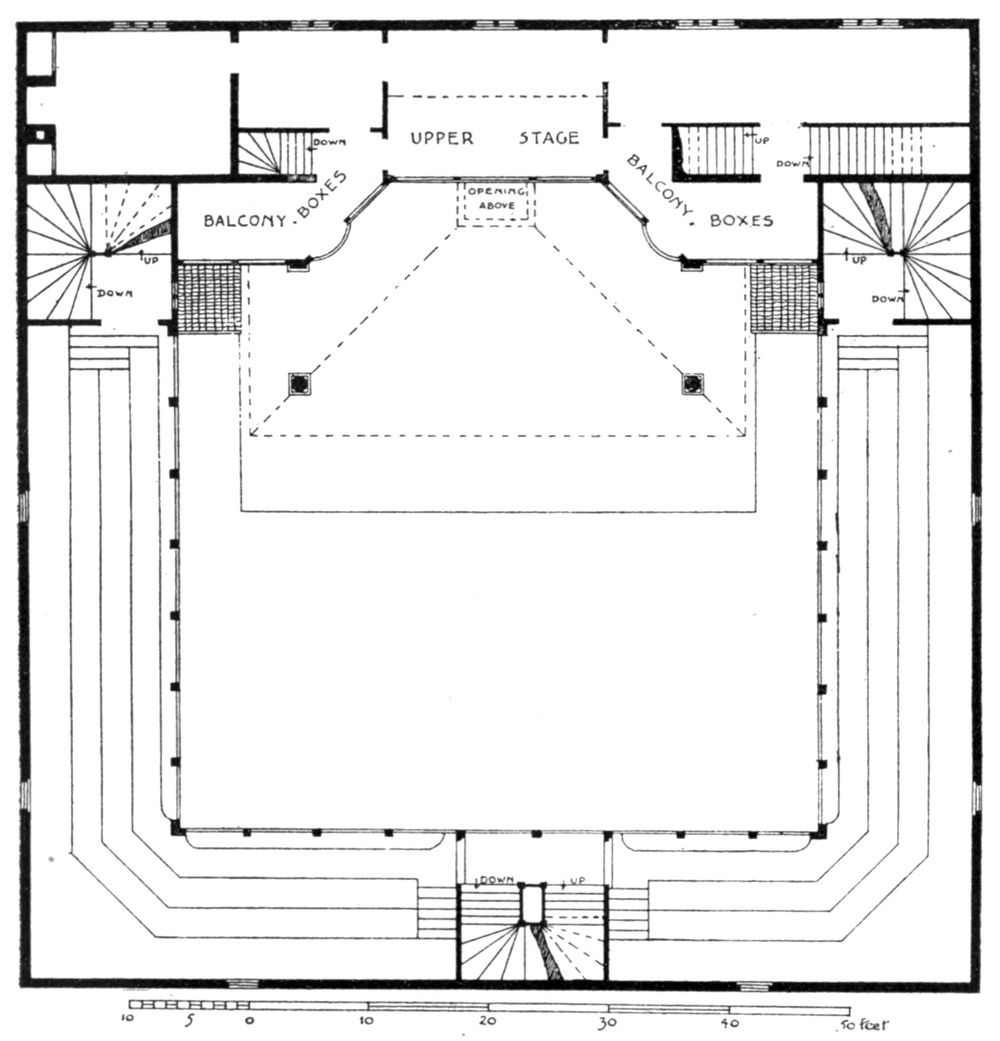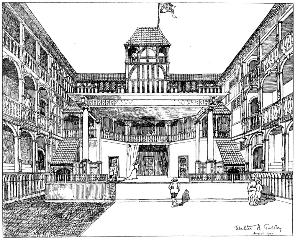 [42] A drawing in the Gardner Collection, supposed to represent the front of the theatre, is reproduced in G. P. Baker’s The Development of Shakespeare as a Dramatist . It indicates a classic building with an open colonnaded portico, but the ascription is doubtful.