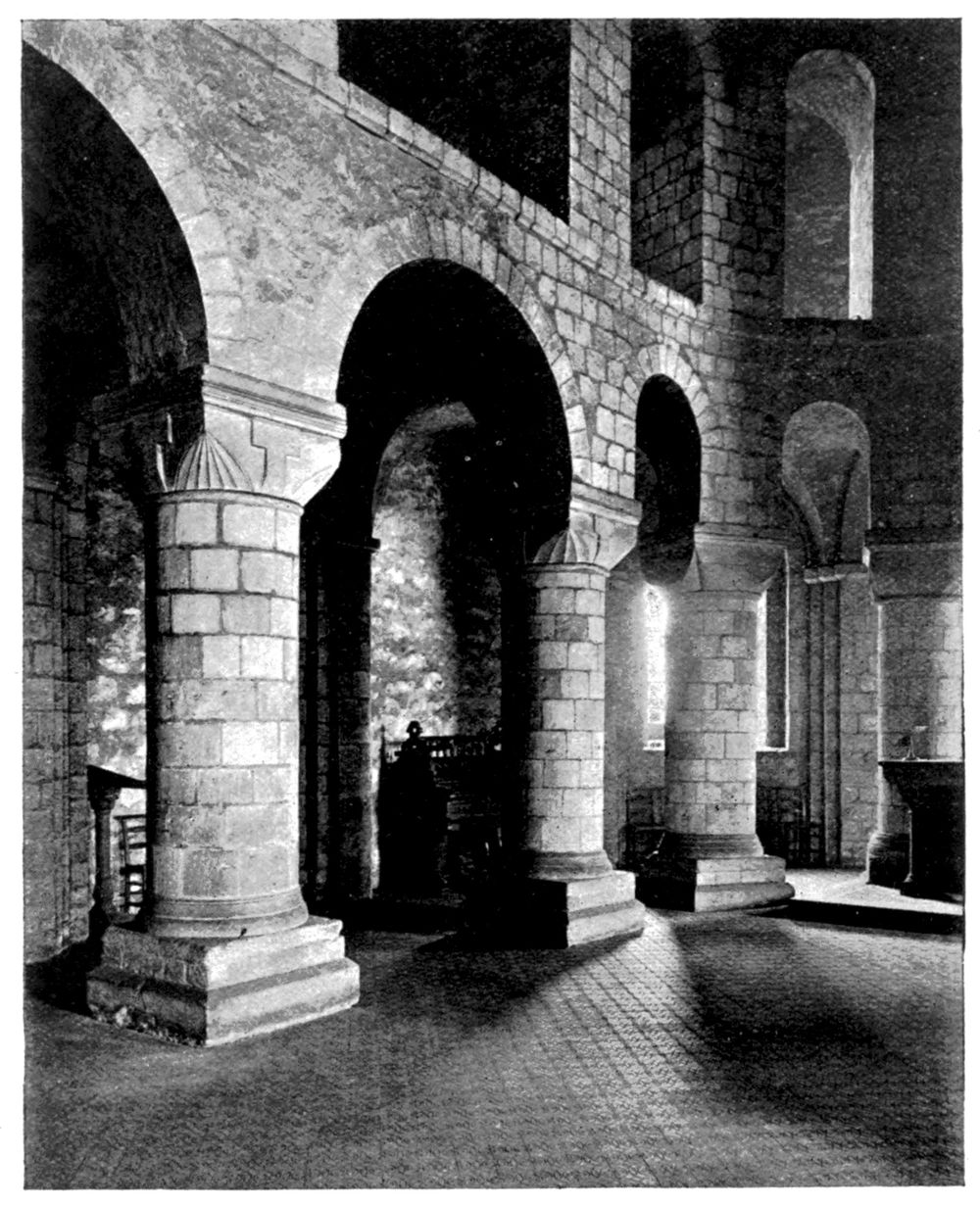 The building in most cases was so arranged that the outside faces of the north and south tower walls were in a line with the inside faces of the piers of the two arches opening into the nave and choir, the lower voussoirs of which thus supported the whole weight of the cross walls above them. The oblong thus became a square, and by this arrangement [245]it was possible to raise a small stone tower in the centre of the church, while at the same time retaining the two arched openings between the nave and the choir.