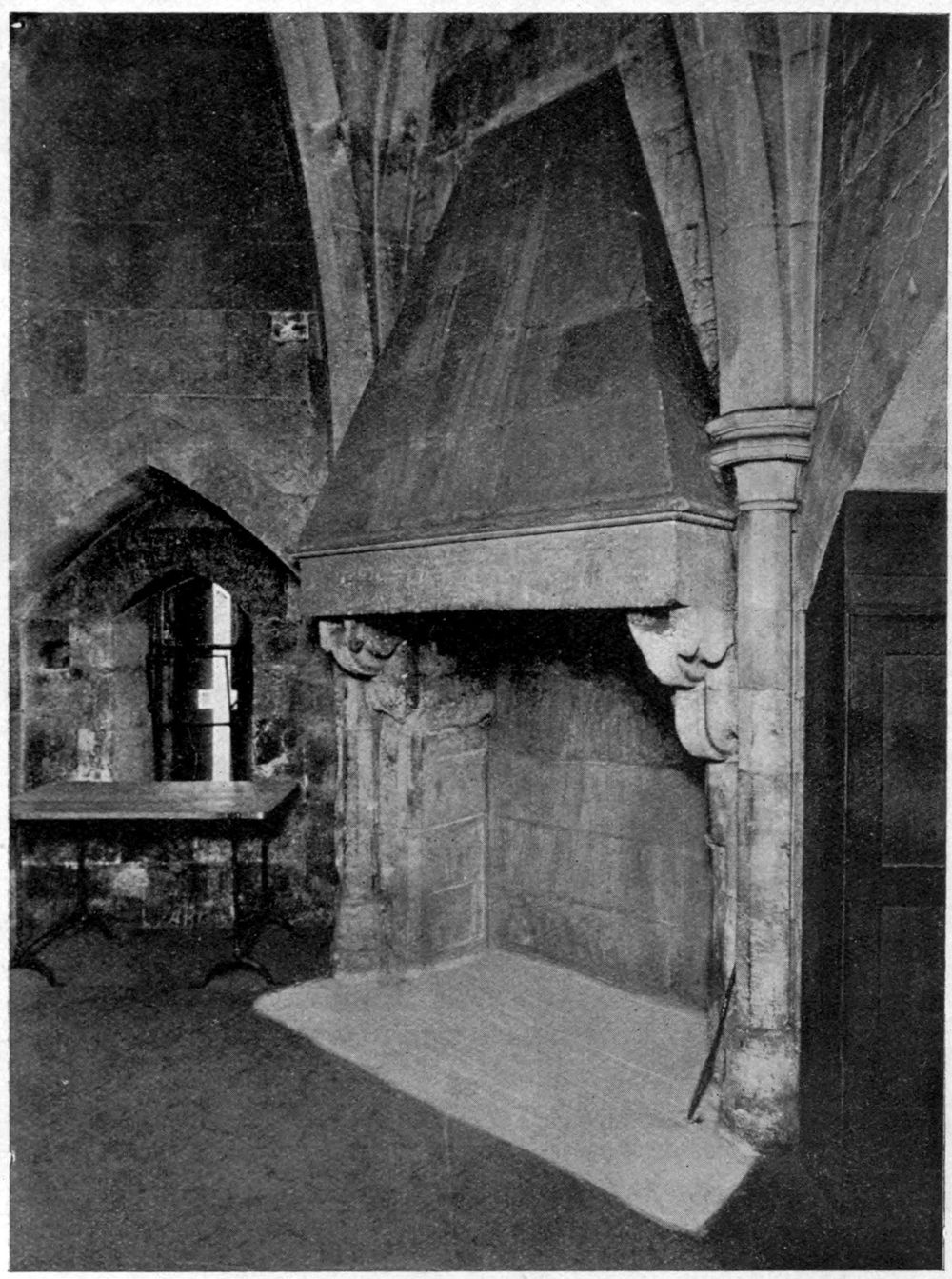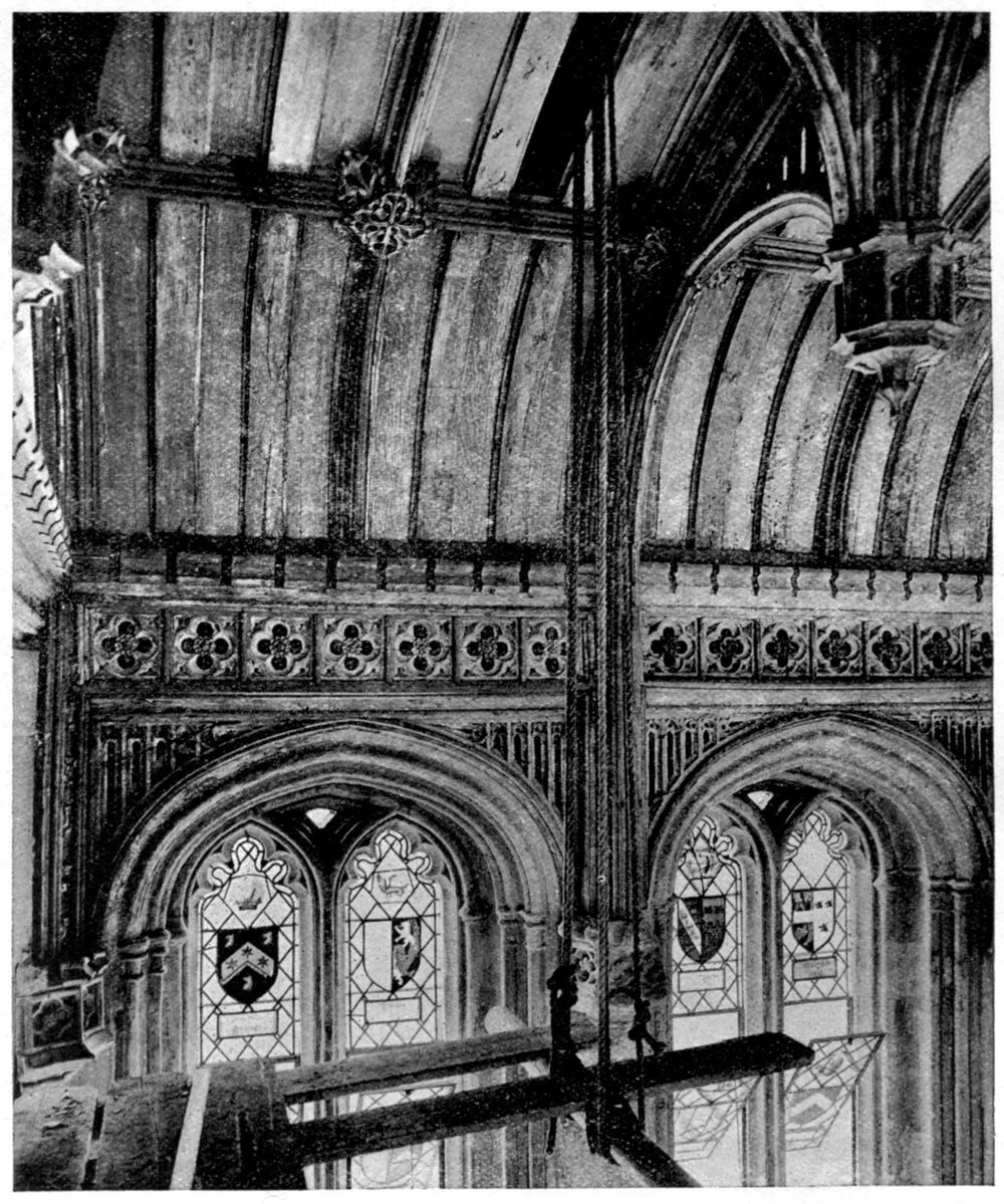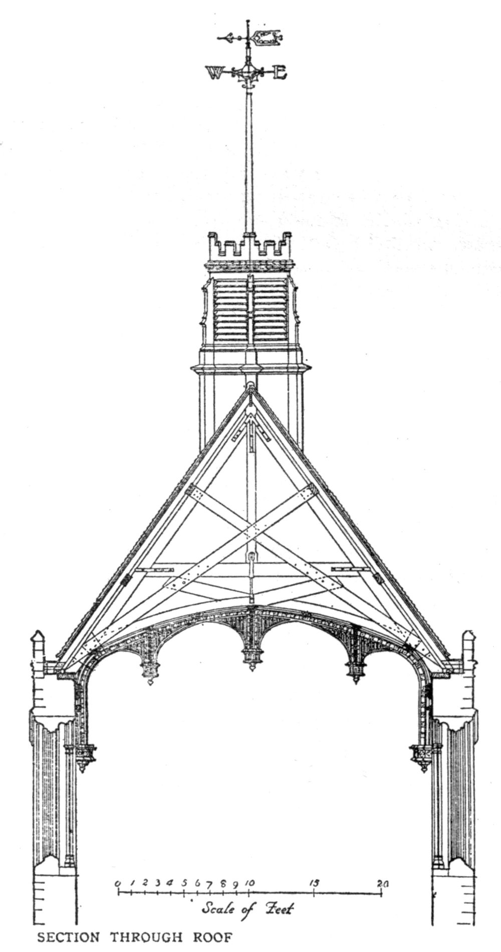 Situated between the choir and the nave, the steeple rested on two parallel walls which ran north and south across the church, and were pierced by two main arches opposite one another opening respectively into the nave and choir; these walls were placed close together, generally some ten feet apart, thus forming an oblong space under the crossing. Between them and high above the arches before mentioned two lesser arches were thrown across the open space (sometimes dying away into the walls and sometimes resting upon corbels projecting from them) to carry the north and south walls of the tower above.