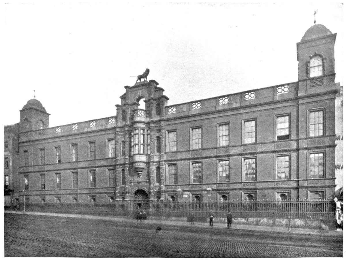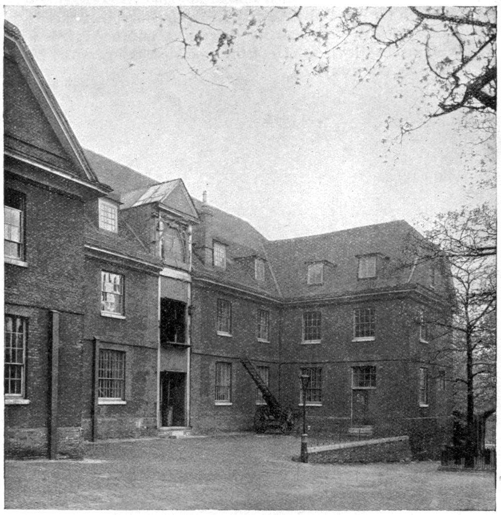 Of the Great Cloister the southern range was occupied by the Frater (or dining hall), and on the east was the Guest House, which, even before the Dissolution, was let out to tenants. This was the lodging prepared for Charles V. in 1522, and the porter’s lodge behind marks the point at which commenced the gallery built by Henry VIII. for the Emperor’s convenience, between the Guest House and Bridewell. A window appears to have been formed between the nave of the Church and the Guest rooms, occupying much the same position as that to be seen at Westminster Abbey. South of this range and communicating with the Frater were the Buttery and Kitchen. The Guest House ultimately passed into the hands of the Apothecaries’ Company (1632), who rebuilt it after the Great Fire. In size and position, therefore, the present building follows precisely that which gave shelter to the Emperor Charles V. To the south of the Kitchen and Buttery was the Chapel of St. Anne, which, though not a parish church, was no doubt erected for the benefit of the various lay inhabitants of the precinct. Its site is now occupied by The Times printing office, and considerable remains came to light in the course of rebuilding in 1872.
