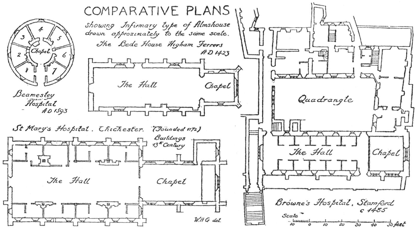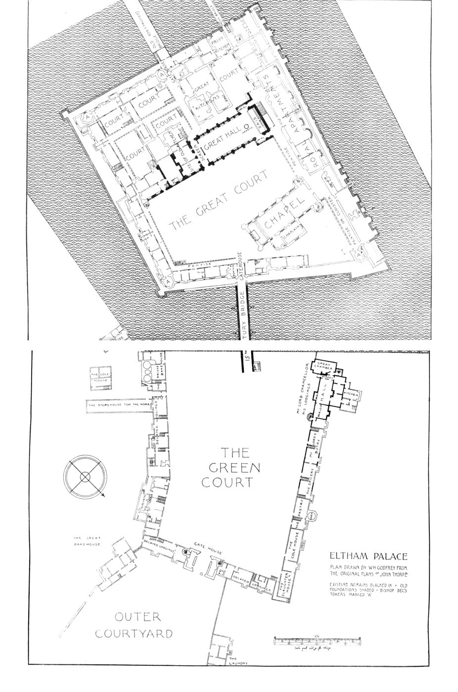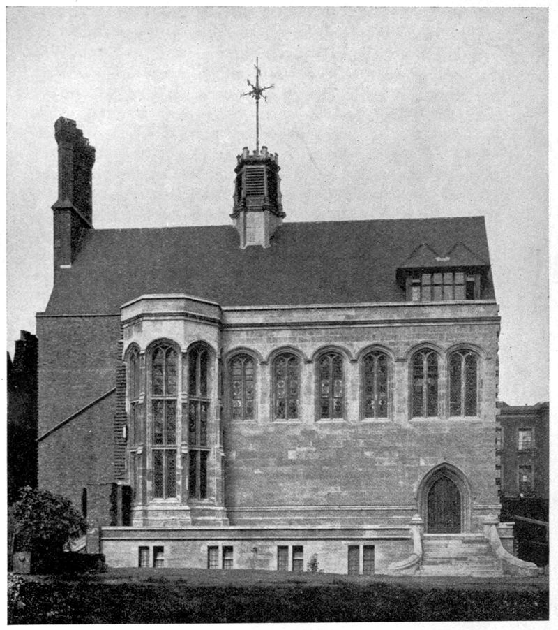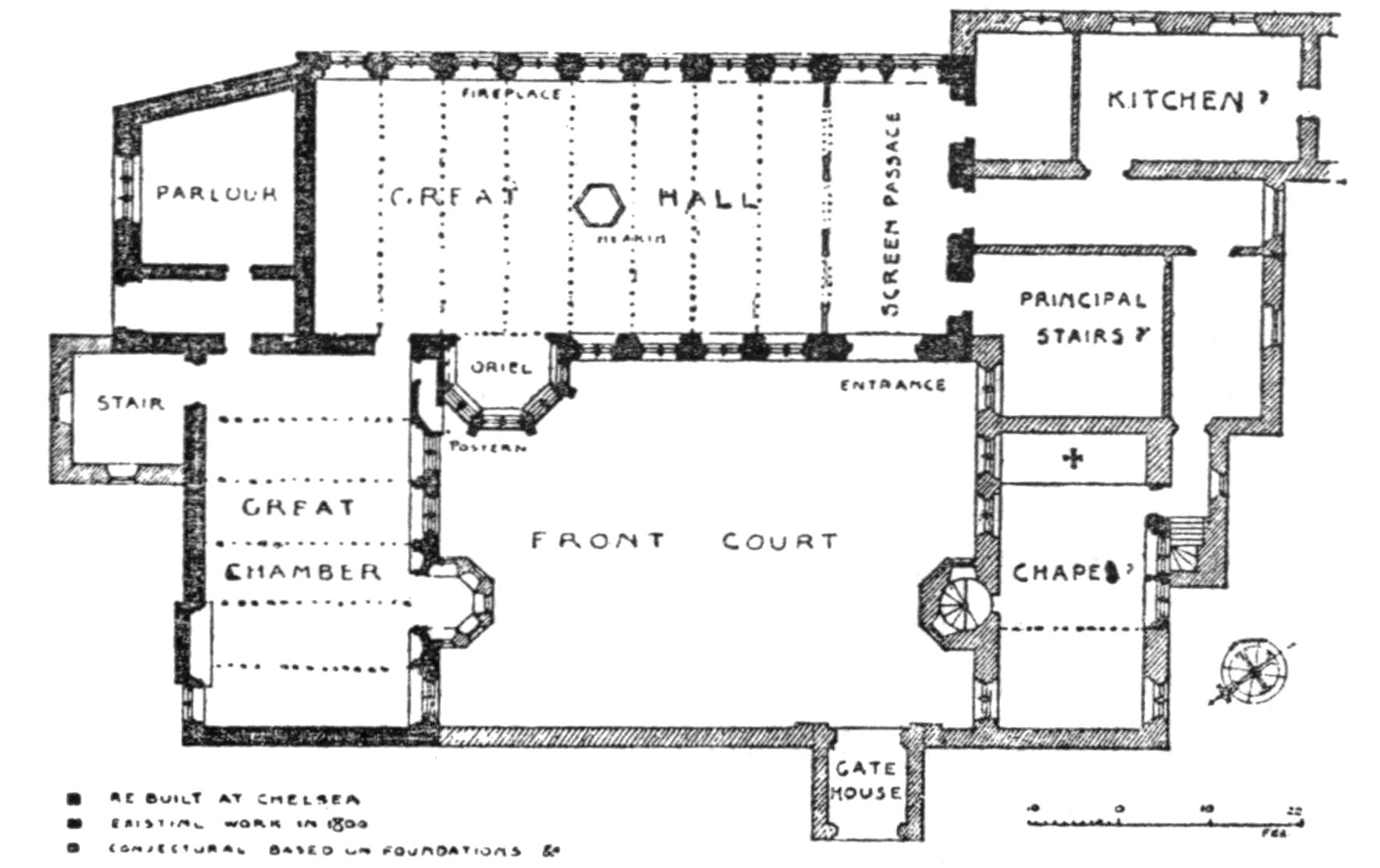 Of the remaining papers, I will merely add that they represent for the most part some particular studies in the more general examination of London buildings which I have undertaken. The articles on Chelsea are an amplification of the material prepared for the Survey of that Parish.[5] That on Crosby Hall is the substance of a lecture delivered before the London and Middlesex Archæological Association, soon after the Hall’s reconstruction. The interpretation of the original Specification of Elizabethan date for the erection of the Fortune Theatre was originally undertaken for Mr. William Archer, and the full details as here presented were first published in the Architectural Review . The only paper that deals with a subject outside London is that on Abbot’s Hospital, Guildford, which provides an excuse for a short account of the chief points of interest in the history of English Almshouses and their plans. I am indebted to Mr. Clapham for details of the building dates of Eltham Palace, which are preserved in the Record Office.
