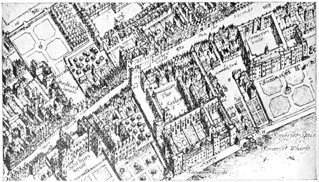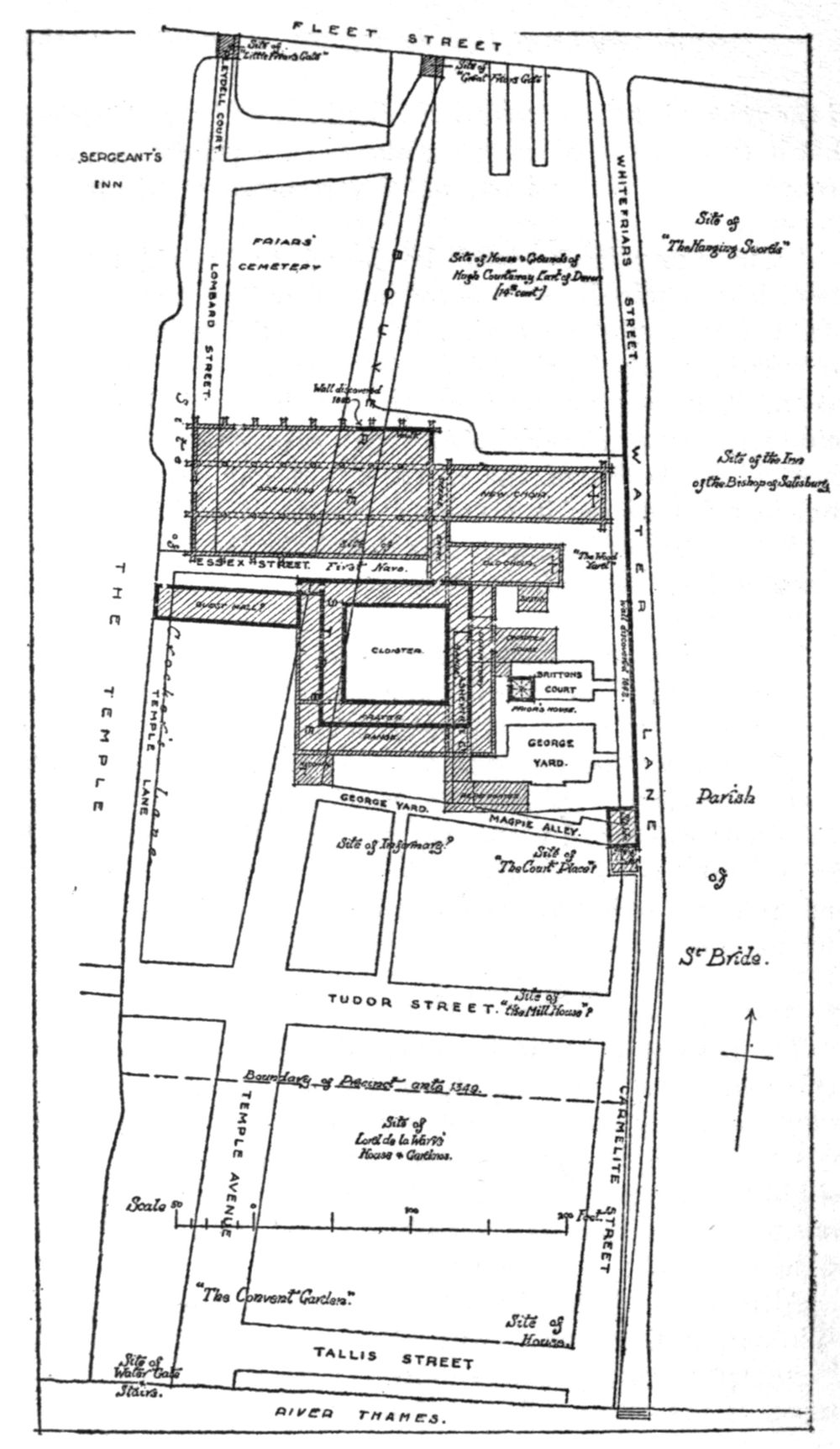 The London house of the Carmelites or the White Friars lay between Fleet Street and the River Thames, their precinct being bounded on the west by the Inner Temple—the present houses of King’s Bench Walk—and on the east, roughly by the present Whitefriars Street. Bouverie Street runs across the nave of their Church and traverses the site of the west walk of the cloister.