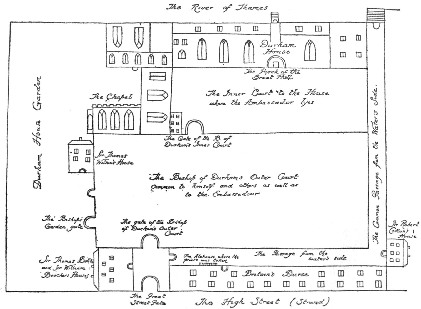 “The mention of Mr. Portinary’s parlour fixes the position of the whole block, and shows that the Duchy chamber flanked the kitchen yard (mentioned above) on the south side, for the same parlour is mentioned as the southern boundary of the yard.