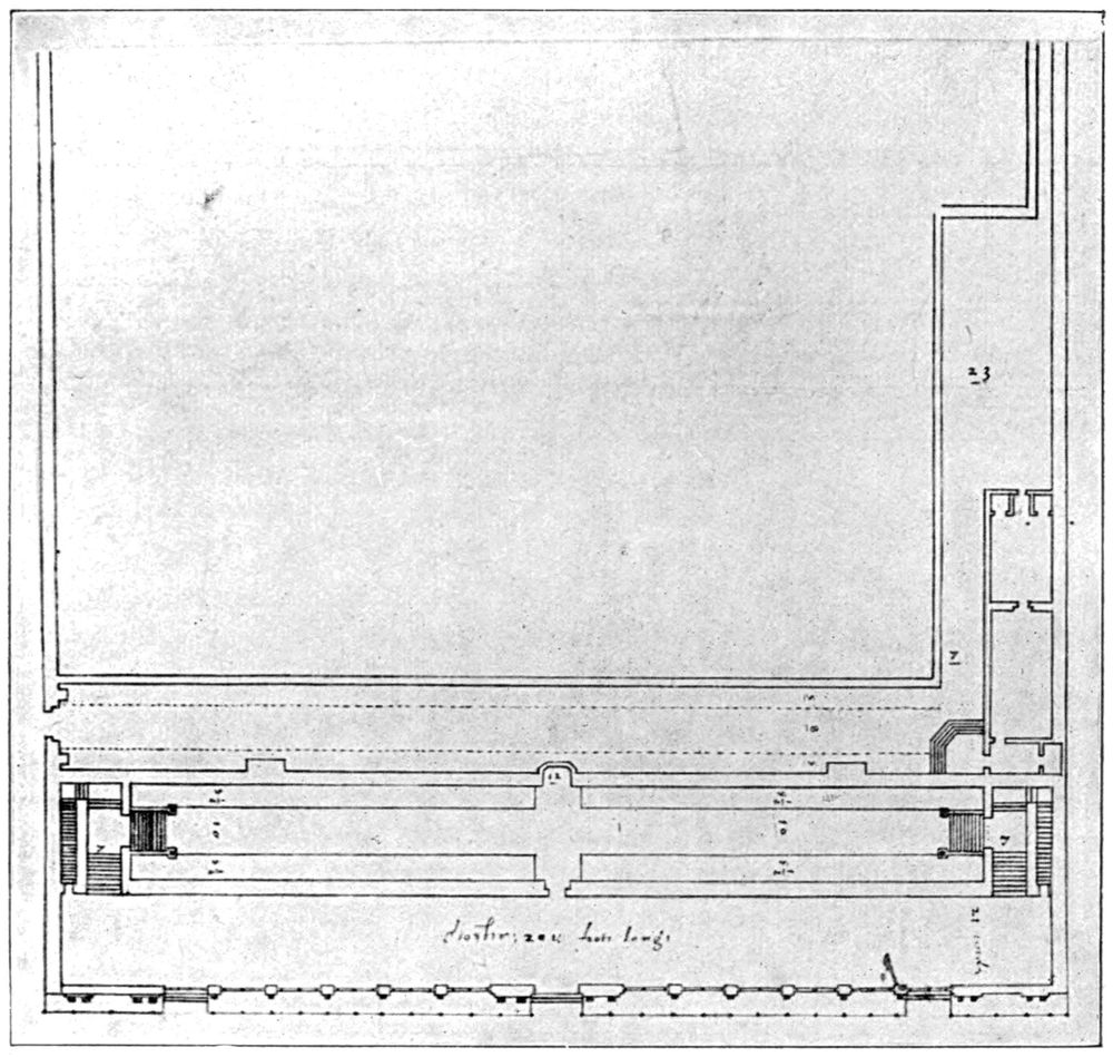 Regarding the “Upper Frater,” which stands still farther south, I will quote from my contribution to Archæologia (vol. lxiii.):—“The only buildings now remaining to be noticed formed a block of considerable size lying to the south-west of the cloister, and quite separate from the ranges flanking it. The main structure of the group was a building of such unusual size and obscure designation that it will be necessary to consider it at some length. Hugh Losse describes it as ‘One house called the upper frater containeth in length 107 ft. by 52 ft., abutting south and east to the Lady Kingston’s house and garden, north to a hall where the King’s revels lieth at this present and west toward the Duchy chamber and Mr. Portinary’s house. A void room being an entry towards the little kitchen and a coal house containing in length 30 ft. and in breadth 17 ft. One chamber called the Duchy chamber, with a dark lodging thereunder containing in length 50 ft. and in breadth 16 ft., abutting against the north end of the said frater and abutting west upon Mr. Portinary’s parlour.’