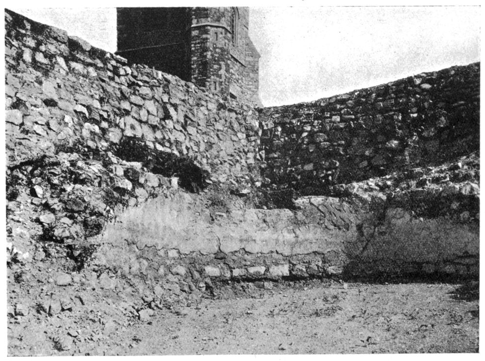 The position of the cloister is accurately shown on the seventeenth century plan already referred to. The Church lay to the north of it, and the north-east angle of the nave was discovered incorporated in some old buildings in Bouverie Street. It was a massive structure of fourteenth or fifteenth century date, built of chalk and ragstone with quoins of Godstone stone. The wall returned at right angles at the east end of the yard at the back of the house, and apparently continued westward right under Bouverie Street, the south having been the internal face. Within the angle was a vault containing the remains perhaps of Sir John Paston, who in his will, dated 1477, bequeaths “my body if I die in the city of London [to the church] of our Lady in the White Friars there, at the north-east corner of the body of the Church, and there to be made an oratory ... to the value of xx ls.”