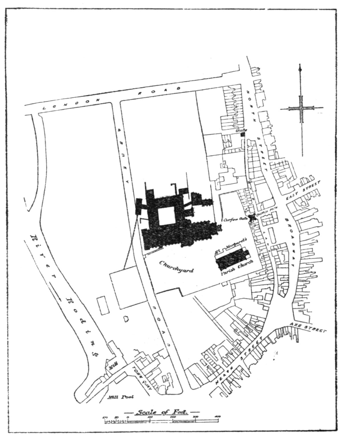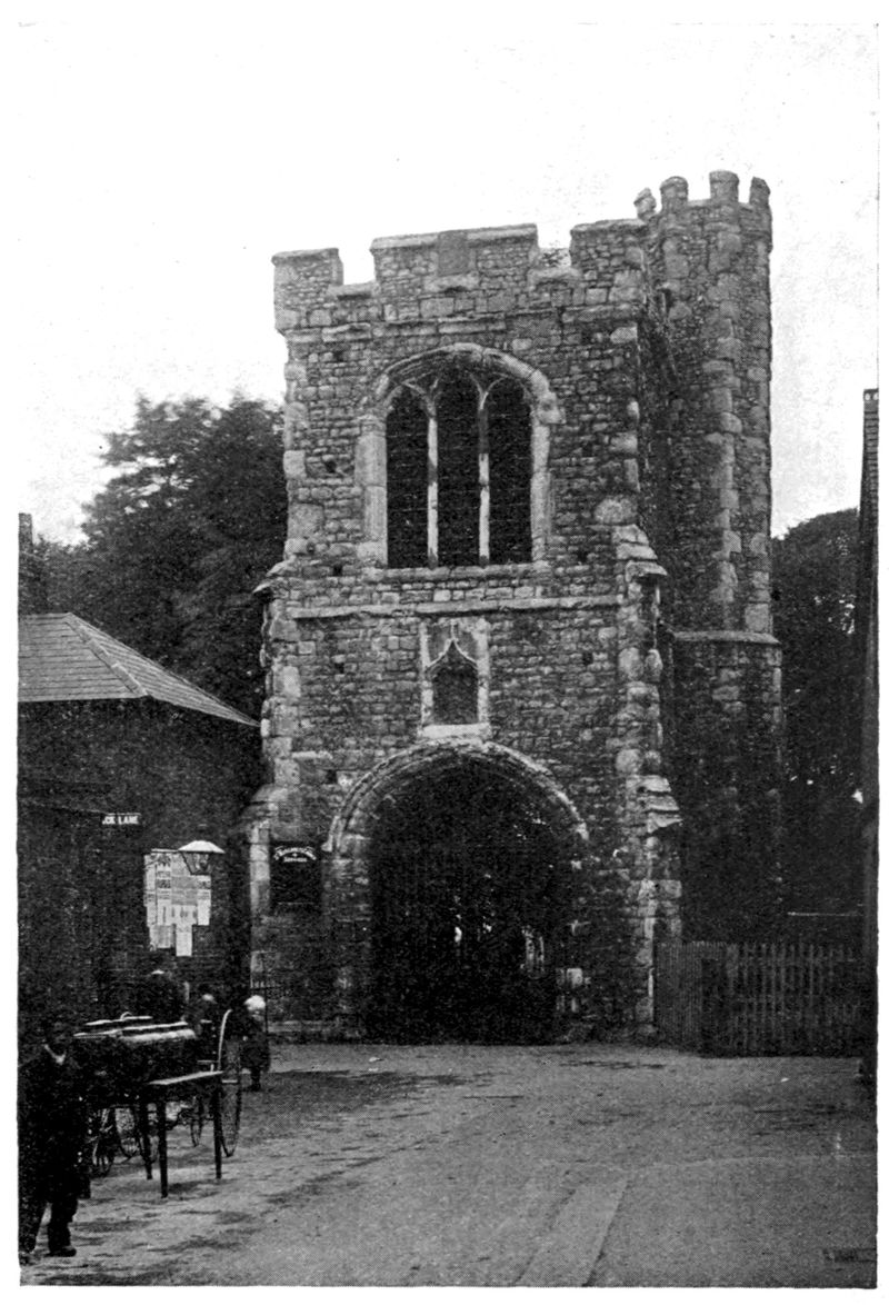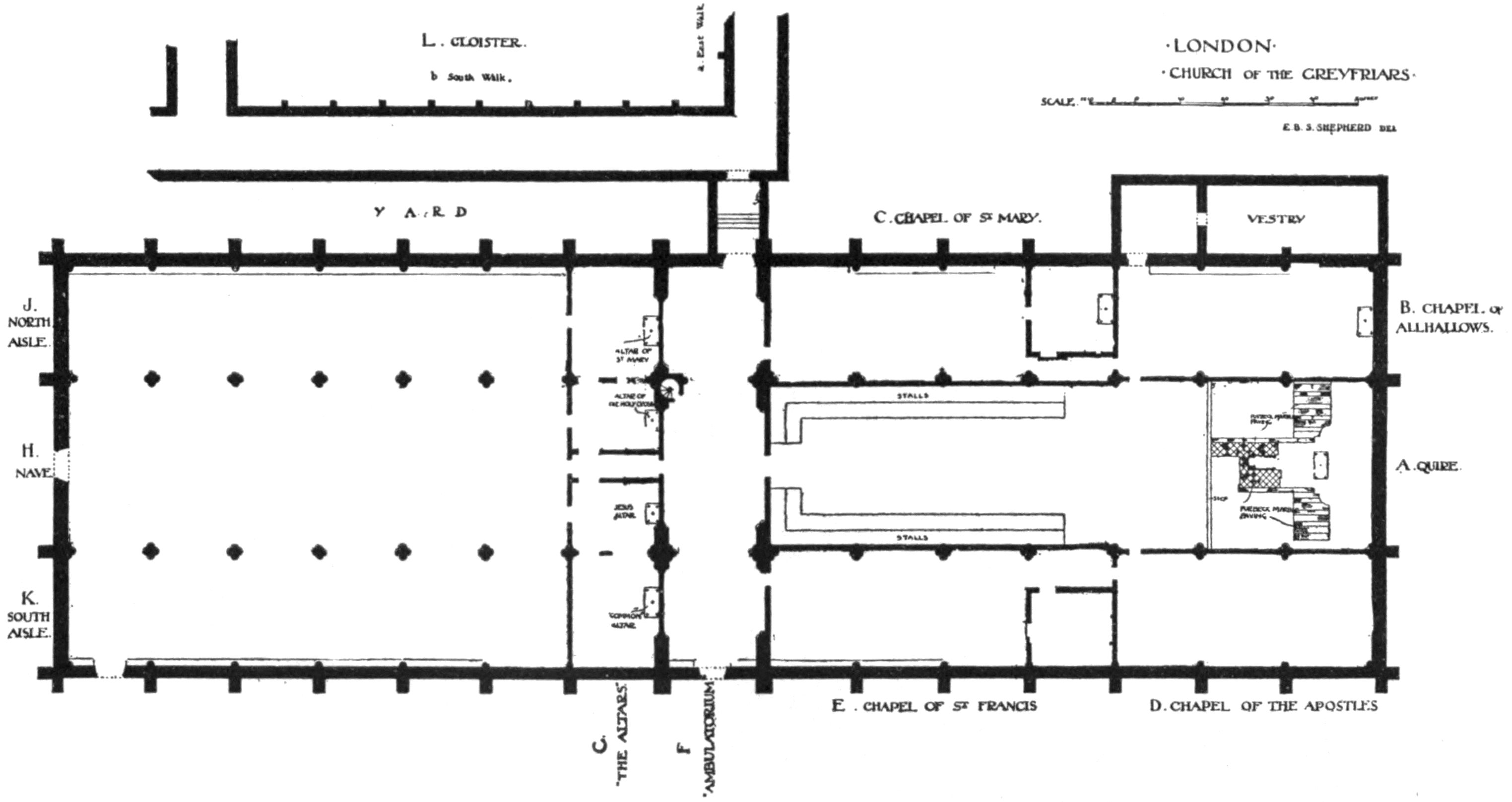 The position of the Church is determined by the Cloister, the east walk of which is now marked by the passage called Church Entry, and its western range of buildings by the Apothecaries’ Hall. The name “Church Entry” points fairly conclusively to the usual passage between the nave and chancel—passing north and south beneath the steeple—that has been already referred to as characteristic of the friars’ plans. The nave with its two aisles measured some 114 feet by 60 feet internally, and alongside its northern aisle at the west end was the Lady Chapel, which increased the width of the west front to 90 feet externally. There is a record of this chapel as early as 1437; but from the will of Robert Castell we gather that it had been rebuilt by Lady Ingoldsthorpe, who died in 1494, sister of John Tiptoft, Earl of Worcester (“the Butcher”), who was executed in 1470. The occasion of the rebuilding may have been the interment of his body, and beside him was later buried the headless body of James Touchet, Lord Audley, who suffered death at the hands of the executioner in 1497.