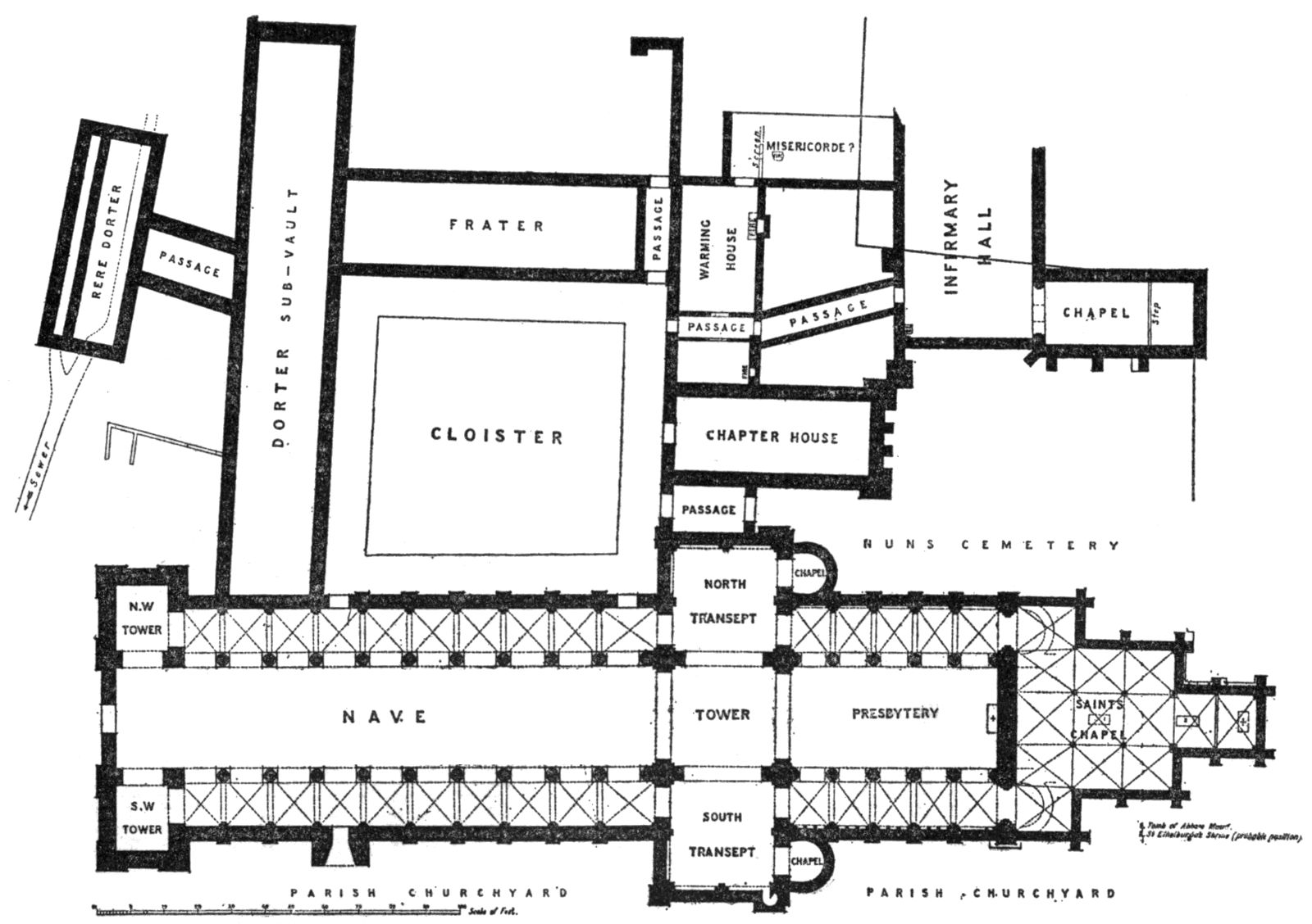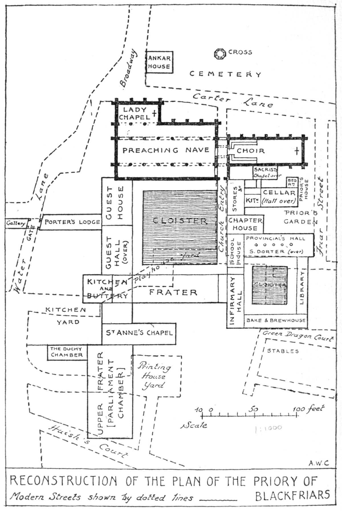 “The writ of summons for this trial describes it as the ‘Parliament Chamber near the Friars Preachers.’ The fact that this name is used is sufficient proof that the great frater [263]of the priory is not referred to, while the term ‘near’ implies that it was not one of the main block of the priory buildings grouped round the cloister, but lay somewhere within the precinct.