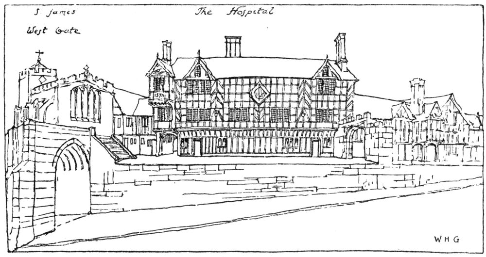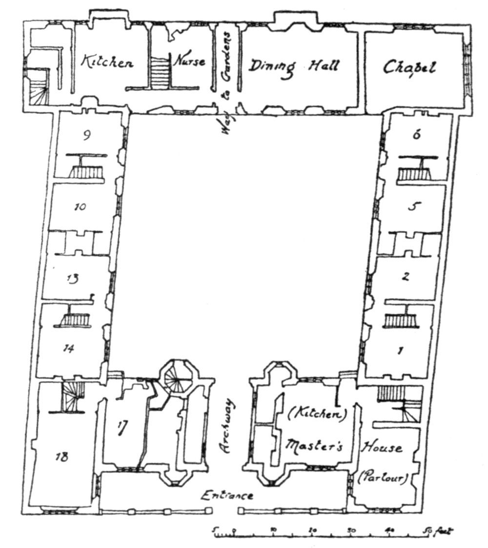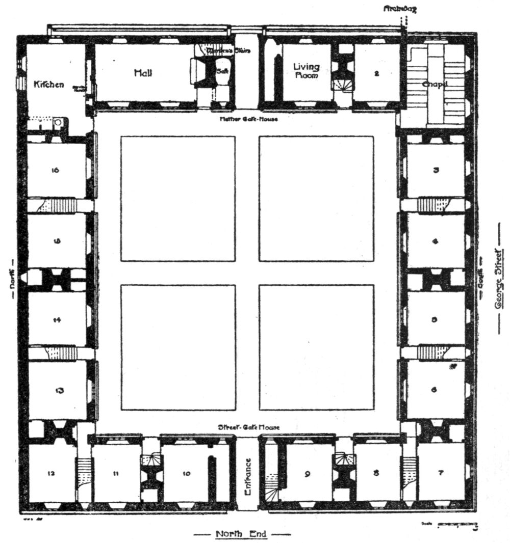 The extensive buildings of the Friary lay round the Great Cloister, and considerably to the south and east. The Chapter House stood in the centre of the eastern range, and over its vestibule and various rooms on the ground floor stretched the dorter (or dormitory), which is described as having a stairway down into the Church. Behind the [260]northern part of the dorter was the Prior’s lodging,[39] and leading eastwards from its southern part was a second or south dorter, built over a vaulted undercroft, remains of which were discovered in 1900. This last-named appears to have been the Provincial’s lodging, and the whole building formed the northern range of the Infirmary or Inner Cloister. The infirmary on the west, the upper and lower libraries on the east, and the bakehouse and brewhouse on the south completed the enclosure.