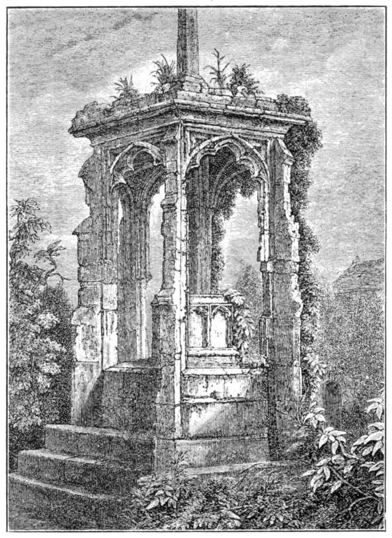 Adjoining the church, in some instances, lay an open yard provided with an outside pulpit either for overflow meetings or for more general use in the heat of the summer. The space outside the Dominican Church at Norwich was long known as the “Preaching Yard,” and the beautiful octagonal stone pulpit cross formerly outside the [247]west front of the church of the same order at Hereford remains intact. It is, now, perhaps, the only remaining example of such a structure in England—an existing counterpart to the rich cross “y-tight with tabernacles” of Pierce Ploughman’s Creed.