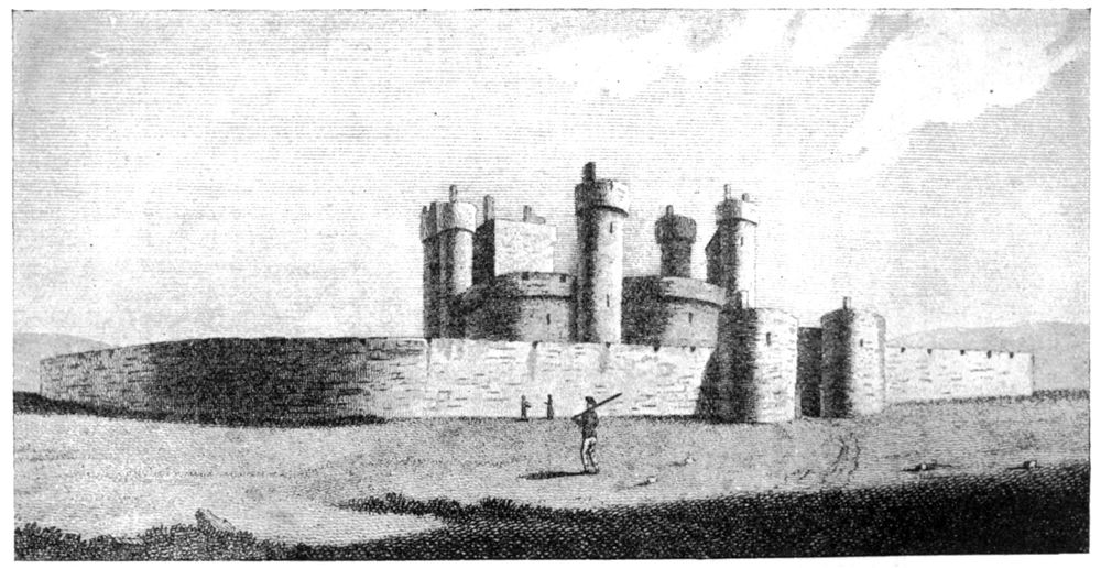 In the history of English military architecture the Castle of Queenborough occupies an isolated position. It was almost the earliest example of the fort, in the modern sense, as opposed to the fortified dwelling-house, and was the immediate precursor of the “castles,” so called, of Henry VIII. Castle-building under Edward I., as exemplified in the great structures reared by that sovereign in Wales, is but little altered in general form from the larger fortifications of the Norman and Angevin kings, the rectangular keep and mound, however, being abandoned. Conway, Carnarvon, and Beaumaris are familiar examples of this period, which was followed by a rapid transition. The tendency became all for compactness and centralisation, the result being a great square block, with towers at the angles and a central courtyard. Numerous buildings of this class, such as Bolton-in-Wensleydale, Wressle, and Sheriff Hutton, were erected towards the close of the fourteenth century, and form almost the latest type of domestic combined with genuine military architecture which this country produced. Queenborough, as we have said, stands quite apart from either class. It provides no domestic accommodation worthy of the name, and its fifty-odd rooms, while imposing in number, were insignificant in size, being placed one above the other in the six lofty circular towers that surrounded the central courtyard. The perfect symmetry of the design is another unusual feature, in which the value of the circular plan, in the defensive warfare of those days, is fully appreciated.
