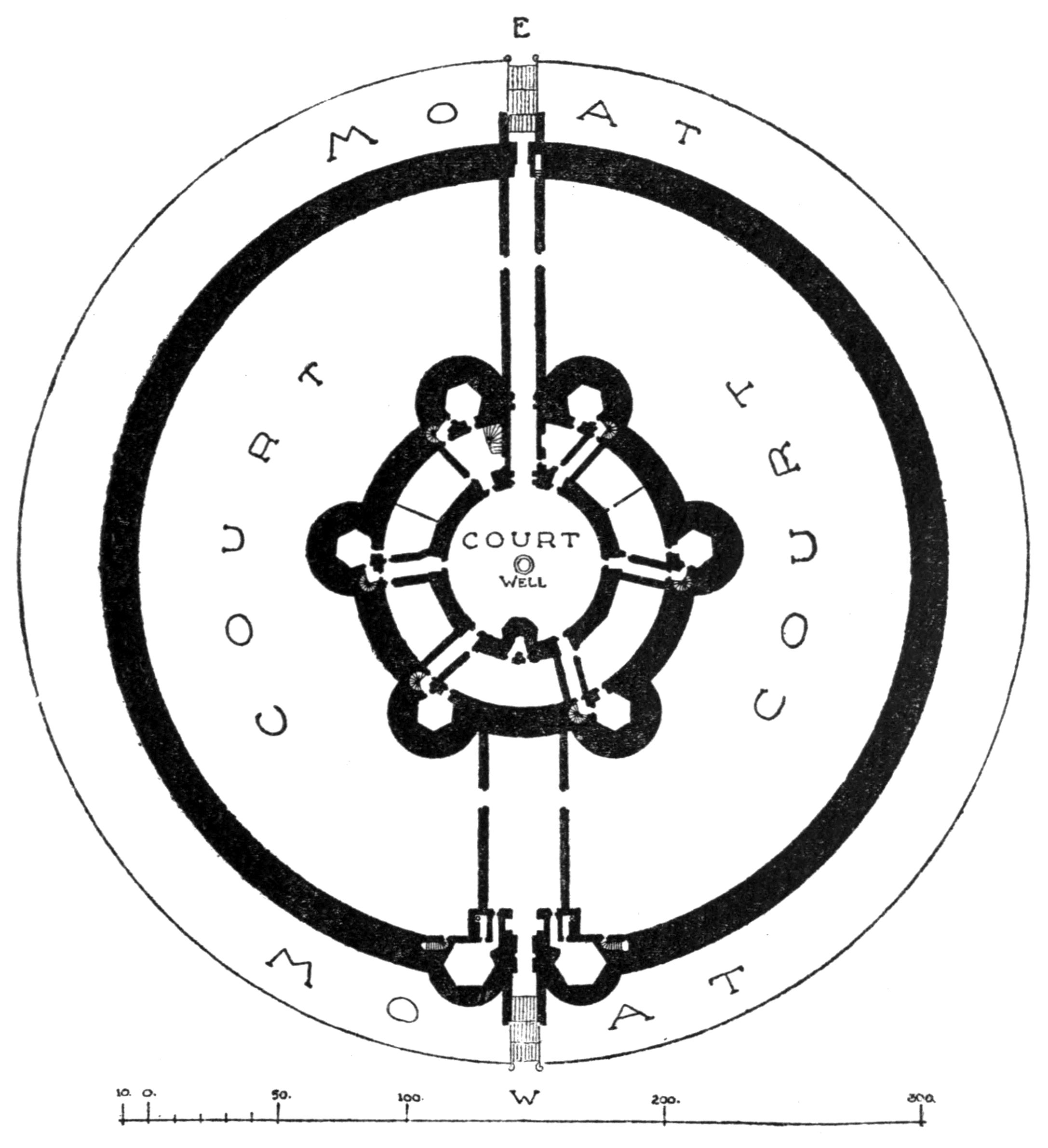 The Island of Sheppey, on which it stood, is a dreary tract of country, separated by a sluggish waterway from the mainland of Kent, and rising on the north side in the low hills of Minster. Since the destruction of the castle, its sole claims to architectural interest are centred in the priory church of Minster and the fine parish church at Eastchurch. The Castle of Queenborough, of which only the earthworks now remain, was begun by Edward III. about the year 1361, and took about six years to build; but from that time little is heard of it till it entered into the extensive schemes of Henry VIII. for the defences of the southern coast, when the building was repaired and brought up to date. On the triumph of the Parliament, Queenborough, in 1650, was surveyed by their orders, with the other Crown lands, with a view to its sale. In this survey it is described as “lying within the common belonging to the town of Queenborough and containing about twelve rooms of one range of building below stairs, and about forty rooms from the first storey upward, being circular and built of stone with six towers and certain out-offices, all the roof being covered with lead. Within the circumference of the castle was one little round court paved with stone, and in the middle one great well, and without the castle was one great court surrounding it, both court and castle being surrounded with a great stone wall, and the outside of that moated round.” The [274]Commissioners speak of it somewhat contemptuously as having been built in the time of bows and arrows, and it was almost immediately sold and pulled down. Fortunately a careful ground plan, here reproduced, is preserved amongst the Hatfield papers, and a drawing by Hollar taken shortly before its demolition gives some indication of the remarkable form and unusual appearance it formerly presented.