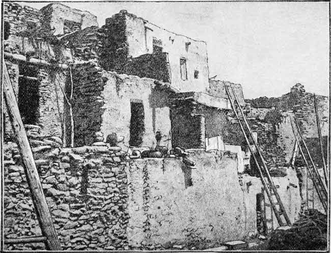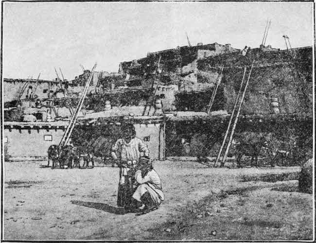 [11] It is the same to-day that it was in 1540,—a place of great strength; and the Mesa can be ascended only by the artificial road. The houses on top are of adobes, one and two stories in height. Water is brought from the valley below by the women in jars of earthenware, which they balance on their heads with wonderful ease as they ascend the high steps and ladders. The present population numbers not over four hundred souls.