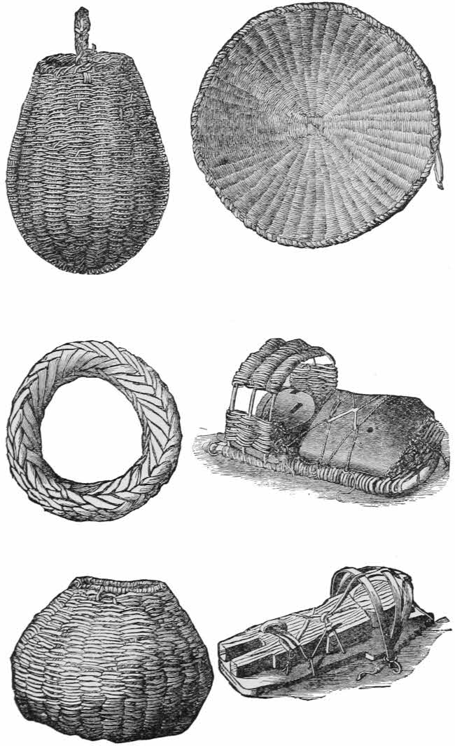If no notice is taken of the appeal there is no further sign; he may hang up his flute, with its bright pencillings and gayly tufted fringes, and there is no mortification in the rejection. Should she smile on his suit she comes out of the coop-like den and the ceremony is ended. Romeo takes her to his house and the bride is at home. If he is a man of moderate means the house is built of four upright stakes, forked at one end, driven into the ground; across these other sticks are laid to support the roof, which may be of corn shucks, or straw or rushes. If he is ambitious to have a lasting, palatial mansion it will be walled round with stakes, plastered and roofed with mud. An opening for a door is left about three feet high to creep in at. These residences are from five to seven feet high, so one cannot stand upright in every one. Adjoining the wigwam is a bower of boughs open on all sides; in [279]this shady lodge are the few potteries in which Juliet does the cooking, and here the happy pair sit on their heels when at rest, and Romeo smokes while she grinds the corn in the metate of stone.