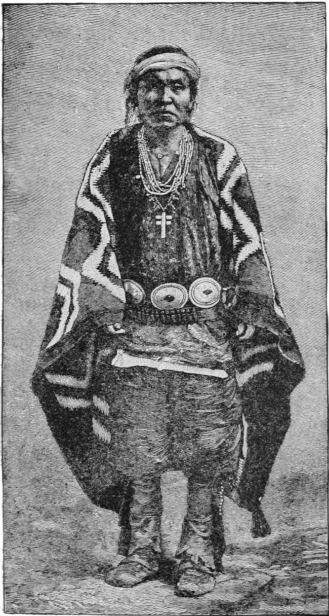 Holding his course northwest, he came to a people “with fixed habitations of great size, made of earth, along a river which runs between two ridges;” and here we have the earliest record of Pueblo or Town Indians, so named as distinguished from nomads or hunting tribes, dwelling in lodges of buffalo-skin and boughs. It is difficult to trace his course along the nameless rivers of Texas; he must have ascended the Red River and then struck across to the Canadian, which runs for miles through a deep cañon, in which are yet seen extensive ruins of ancient cities. Undoubtedly he was then among the Pueblo Indians, in the northwestern part of New Mexico. He described them as an intelligent race, with fine persons, possessing great strength, and gave them the name “Cow Nation,” because of the immense number of buffaloes killed in their country and along the river for fifty leagues. The region was very populous, and throughout were signs of a better civilization. The women were better treated and better clad; “they had shawls of cotton;[2] their dress was a skirt of cotton that came to the knees, and skirts of dressed deer-skins to the ground, opened in front and fastened with leather straps. They washed their clothes with a certain soapy root which cleansed them well.[3] They also wore shoes.” This is the first account of the natives of that country wearing covering on their feet—doubtless the moccasins still worn by them.