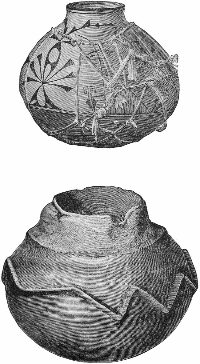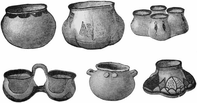 The chiefs told Coronado that their towns were older than the memory of seven generations. They were all built on the same plan, in blocks shaped like a parallelogram, and were from two to four stories high, with terraces receding from the outside. The lower story, without openings, was entered from above by ladders, which were pulled up, and secured them against Indian warfare. There was no interior communication between the stories; the ascent outside was made from one terrace to another. The houses were of sun-dried bricks, and for plaster they used a mixture of ashes, earth, and coal. Every village had from one to seven estufas, built partly underground, walled over the top with flat roofs, and [26]used for political and religious purposes. As in certain other mystic lodges which date back to the days of King Solomon, women were not admitted. All matters of importance were there discussed; there the consecrated fires were kept burning, and were never allowed to go out. The women wore on their shoulders a sort of mantle, which they fastened round the neck, passing it under the right arm, and skirts of cotton. “They also,” writes Castenada, “make garments of skins very well dressed, and trick off the hair behind the ears in the shape of a wheel, which resembles the handle of a cup.” They wore pearls on their heads and necklaces of shells. Everywhere were plenty of glazed pottery and vases of curious form and workmanship, reminding the Spaniards of the jars of Guadarrama in old Spain.