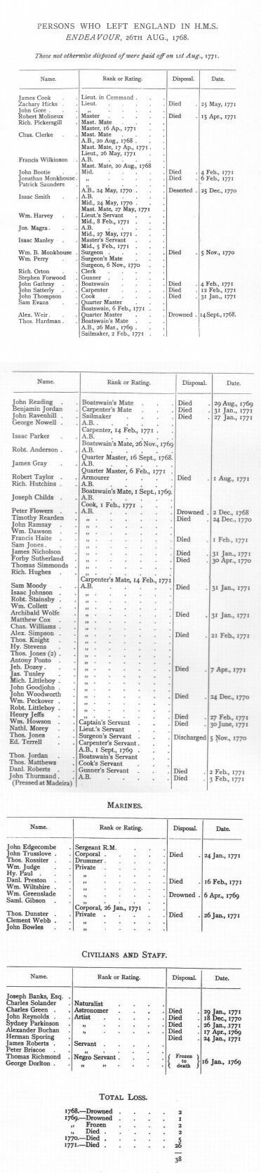 LIST OF PERSONS WHO LEFT ENGLAND IN H.M.S. ENDEAVOUR, 26TH AUGUST, 1768.