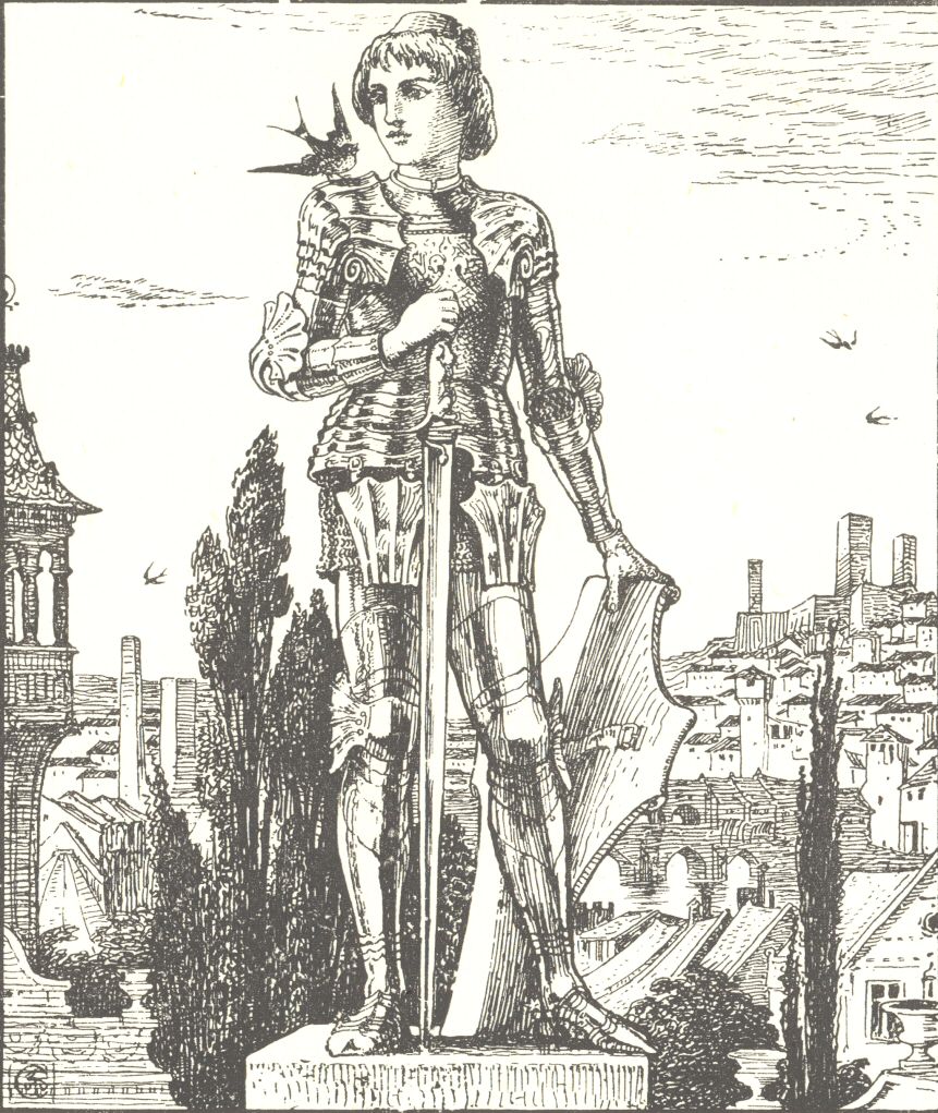 “Far away,” continued the statue in a low musical voice, “far away in a little street there is a poor house. One of the windows is open, and through it I can see a woman seated at a table. Her face is thin and worn, and she has coarse, red hands, all pricked by the needle, for she is a seamstress. She is embroidering passion-flowers on a satin gown for the loveliest of the Queen’s maids-of-honour to wear at the next Court-ball. In a bed in the corner of the room her little boy is lying ill. He has a fever, and is asking for oranges. His mother has nothing to give him but river water, so he is crying. Swallow, Swallow, little Swallow, will you not bring her the ruby out of my sword-hilt? My feet are fastened to this pedestal and I cannot move.”