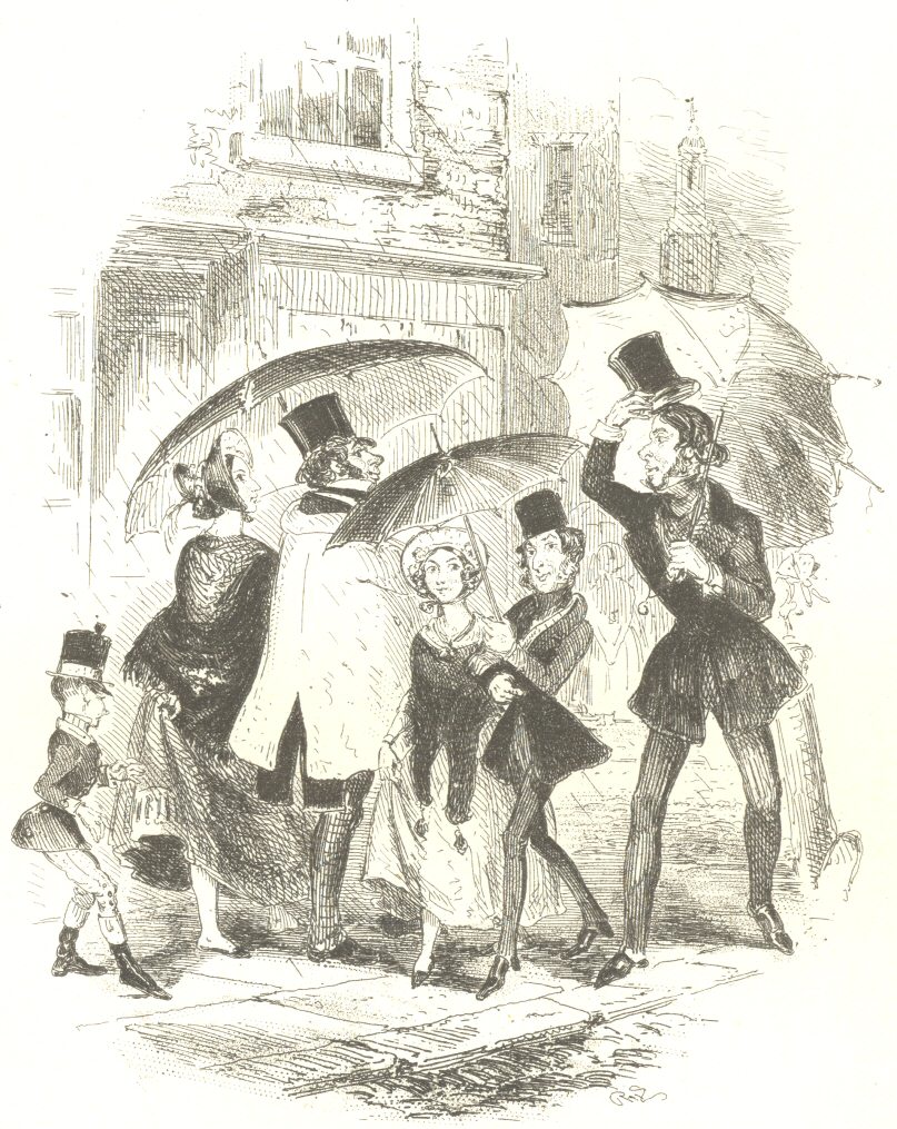 Now, for at least six weeks last past it has been solemnly devised and settled that the young couple should go away in secret; but they no sooner appear without the door than the drawing-room windows are blocked up with ladies waving their handkerchiefs and kissing their hands, and the dining-room panes with gentlemen’s faces beaming farewell in every queer variety of its expression. The hall and steps are crowded with servants in white favours, mixed up with particular friends and relations who have darted out to say good-bye; and foremost in the group are the tiny lovers arm in arm, thinking, with fluttering hearts, what happiness it would be to dash away together in that gallant coach, and never part again.