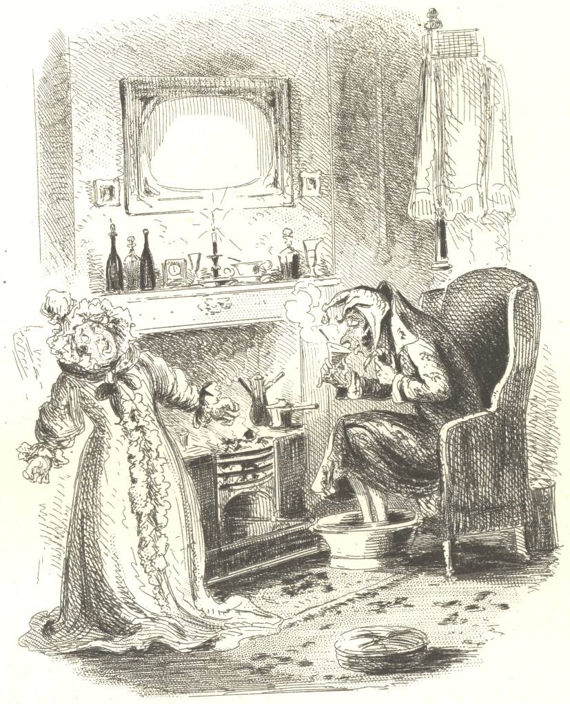 In this last opinion Mrs. Merrywinkle and her respected mother fully concur; for though not present, their thoughts and tongues are occupied with the same subject, which is their constant theme all day. If anybody happens to call, Mrs. Merrywinkle opines that they must assuredly be mad, and her first salutation is, ‘Why, what in the name of goodness can bring you out in such weather? You know you must catch your death.’ This assurance is corroborated by Mrs. Chopper, who adds, in further confirmation, a dismal legend concerning an individual of her acquaintance who, making a call under precisely parallel circumstances, and being then in the best health and spirits, expired in forty-eight hours afterwards, of a complication of inflammatory disorders. The visitor, rendered not altogether comfortable perhaps by this and other precedents, inquires very affectionately after Mr. Merrywinkle, but by so doing brings about no change of the subject; for Mr. Merrywinkle’s name is inseparably connected with his complaints, and his complaints are inseparably connected with Mrs. Merrywinkle’s; and when these are done with, Mrs. Chopper, who has been biding her time, cuts in with the chronic disorder—a subject upon which the amiable old lady never leaves off speaking until she is left alone, and very often not then.