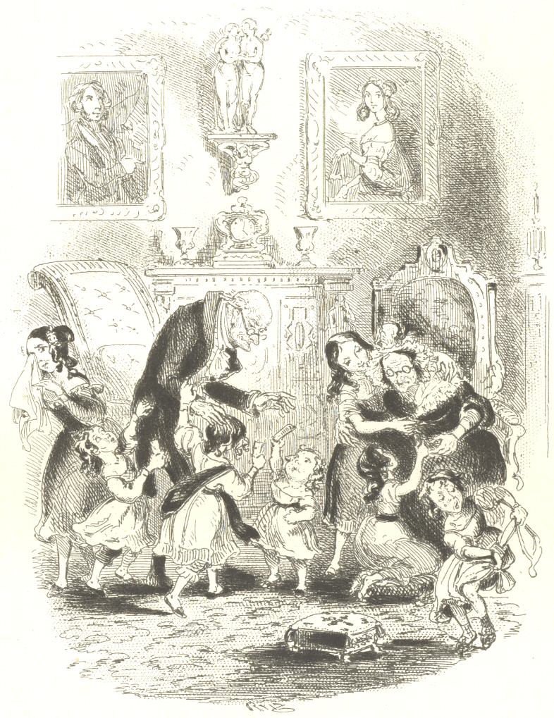 How many people in all, grandchildren, great-grandchildren, and one or two intimate friends of the family, dine together to-day at the eldest son’s to congratulate the old couple, and wish them many happy returns, is a calculation beyond our powers; but this we know, that the old couple no sooner present themselves, very sprucely and carefully attired, than there is a violent shouting and rushing forward of the younger branches with all manner of presents, such as pocket-books, pencil-cases, pen-wipers, watch-papers, pin-cushions, sleeve-buckles, worked-slippers, watch-guards, and even a nutmeg-grater: the latter article being presented by a very chubby and very little boy, who exhibits it in great triumph as an extraordinary variety. The old couple’s emotion at these tokens of remembrance occasions quite a pathetic scene, of which the chief ingredients are a vast quantity of kissing and hugging, and repeated wipings of small eyes and noses with small square pocket-handkerchiefs, which don’t come at all easily out of small pockets. Even the peevish bachelor is moved, and he says, as he presents the old gentleman with a queer sort of antique ring from his own finger, that he’ll be de’ed if he doesn’t think he looks younger than he did ten years ago.