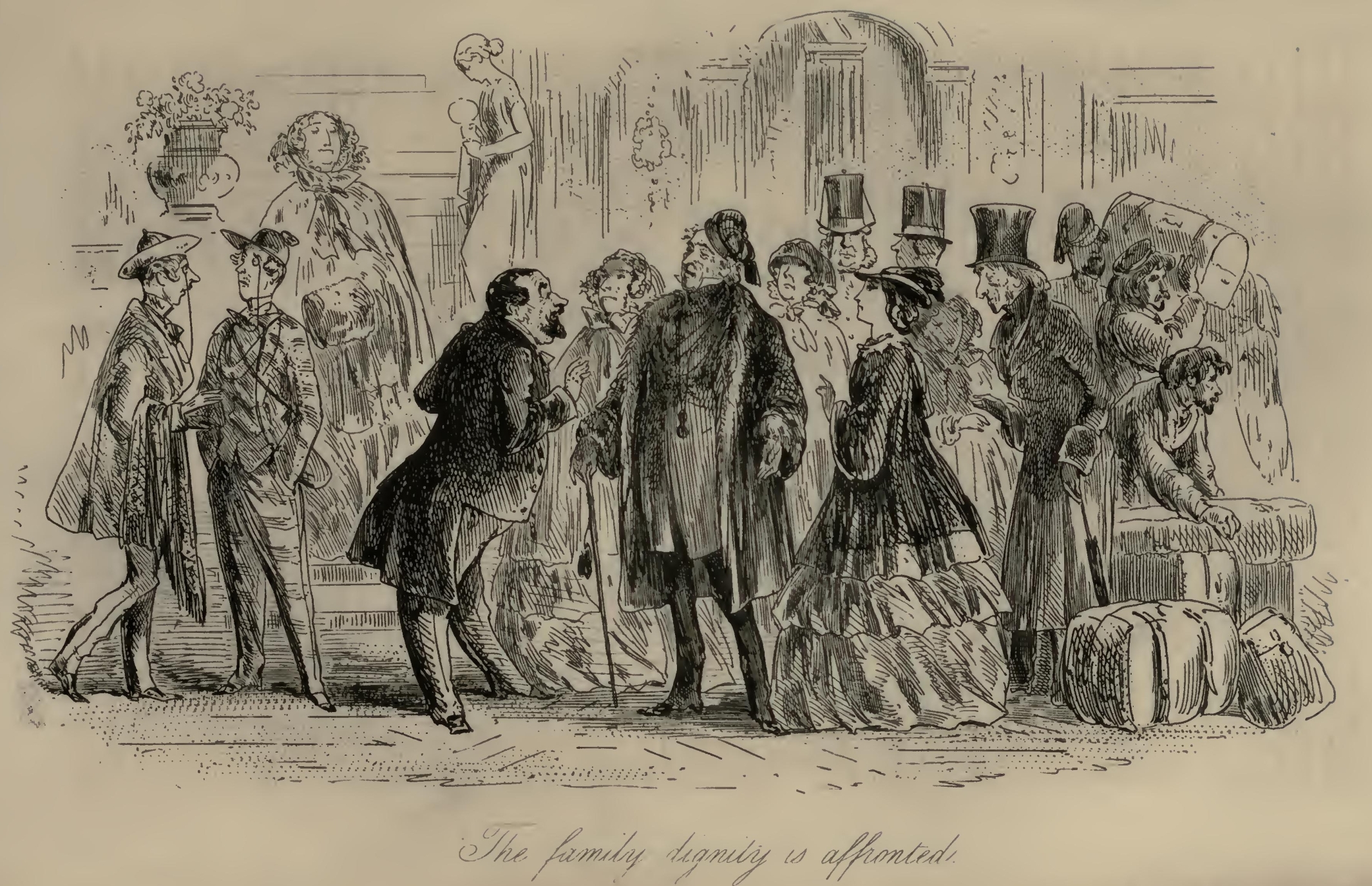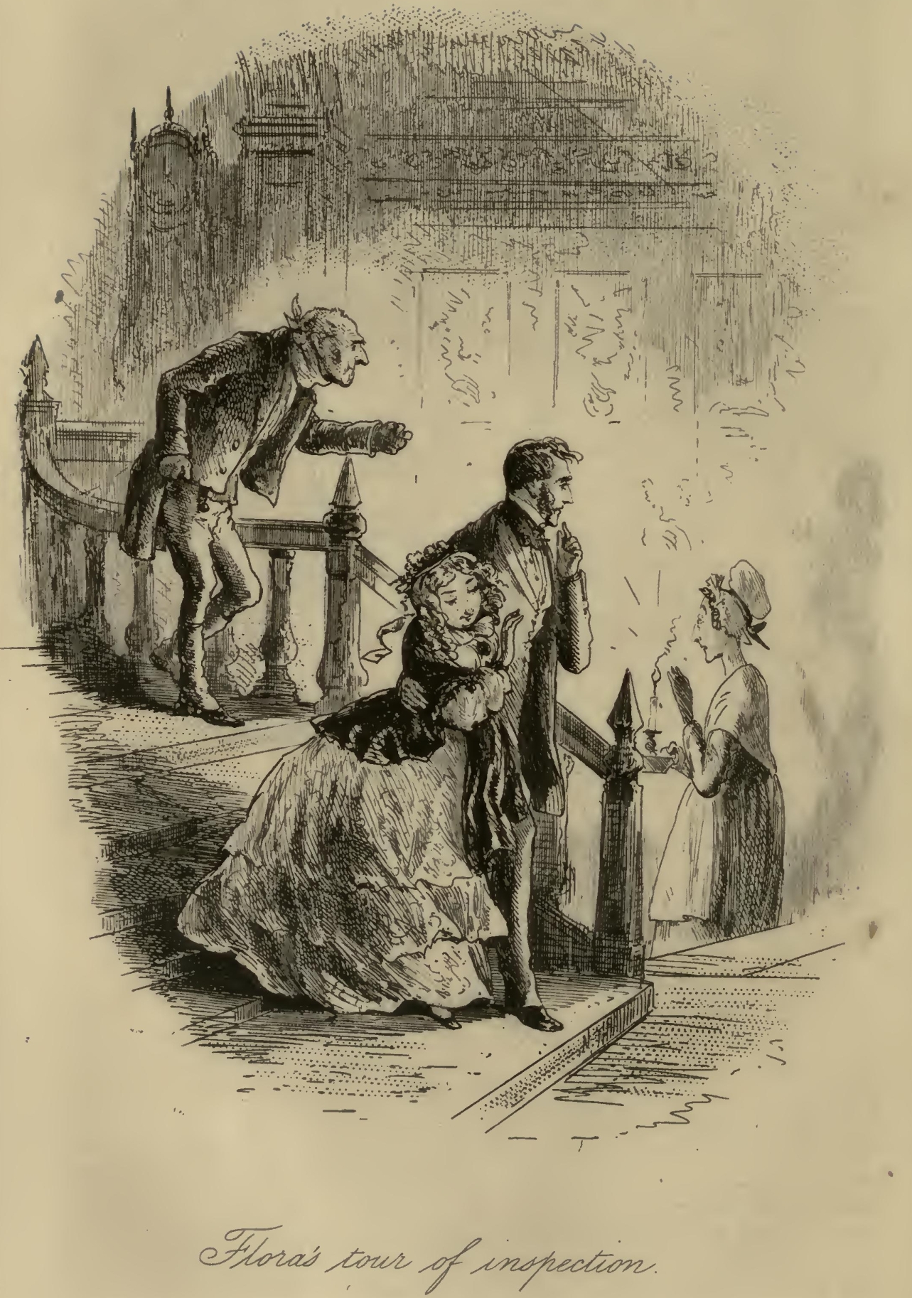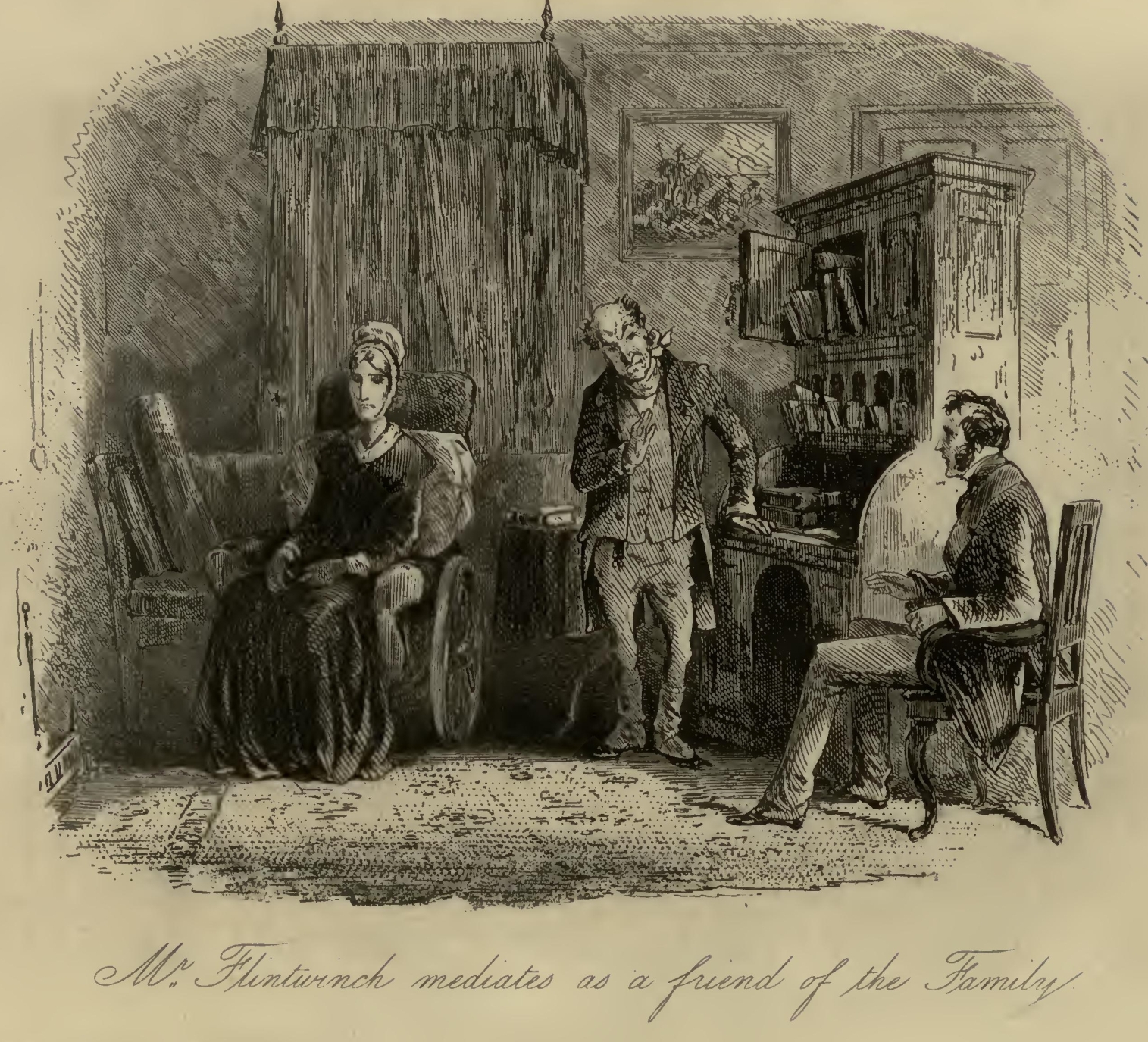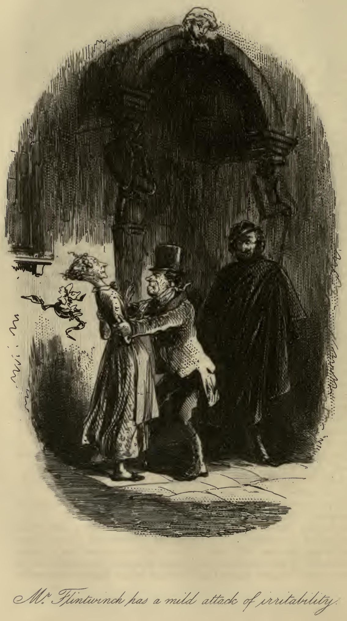 Flora’s eyes were a little red, and she seemed rather out of spirits. Mr F.‘s Aunt was so stiffened that she had the appearance of being past bending by any means short of powerful mechanical pressure. Her bonnet was cocked up behind in a terrific manner; and her stony reticule was as rigid as if it had been petrified by the Gorgon’s head, and had got it at that moment inside. With these imposing attributes, Mr F.‘s Aunt, publicly seated on the steps of the Marshal’s official residence, had been for the two or three hours in question a great boon to the younger inhabitants of the Borough, whose sallies of humour she had considerably flushed herself by resenting at the point of her umbrella, from time to time.