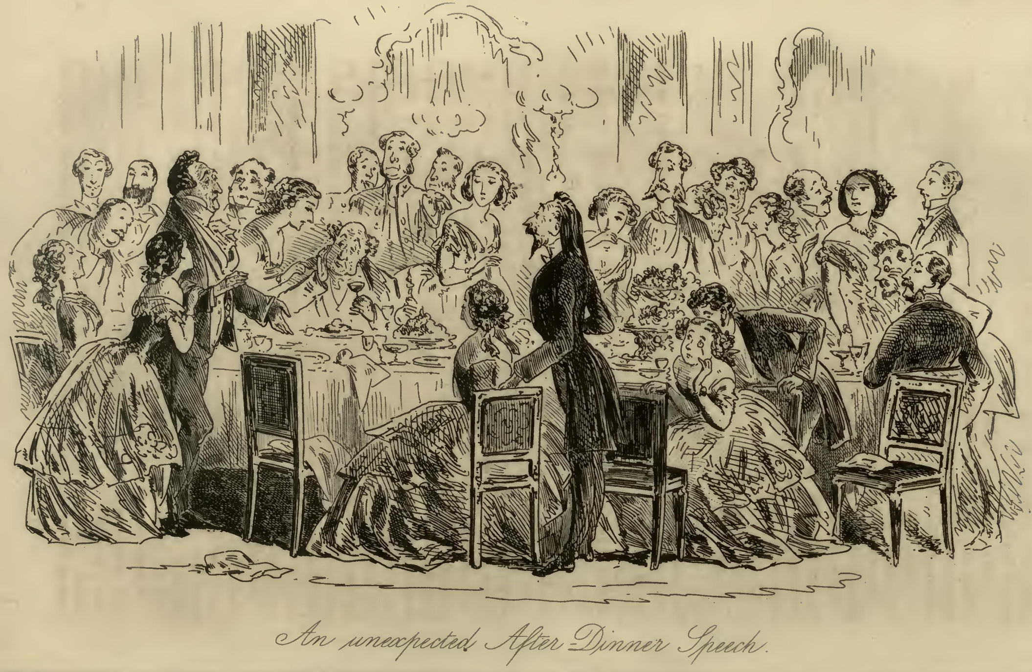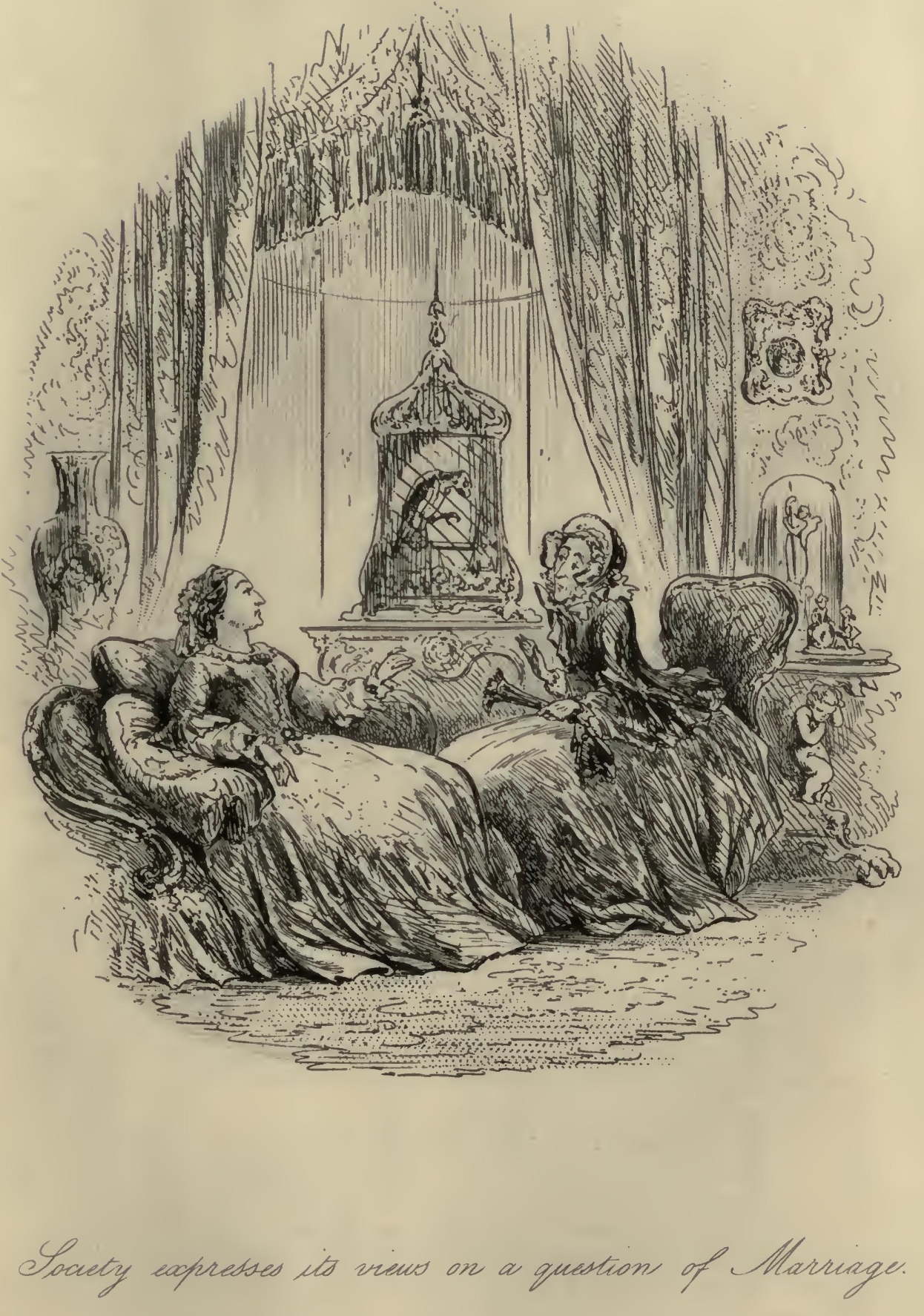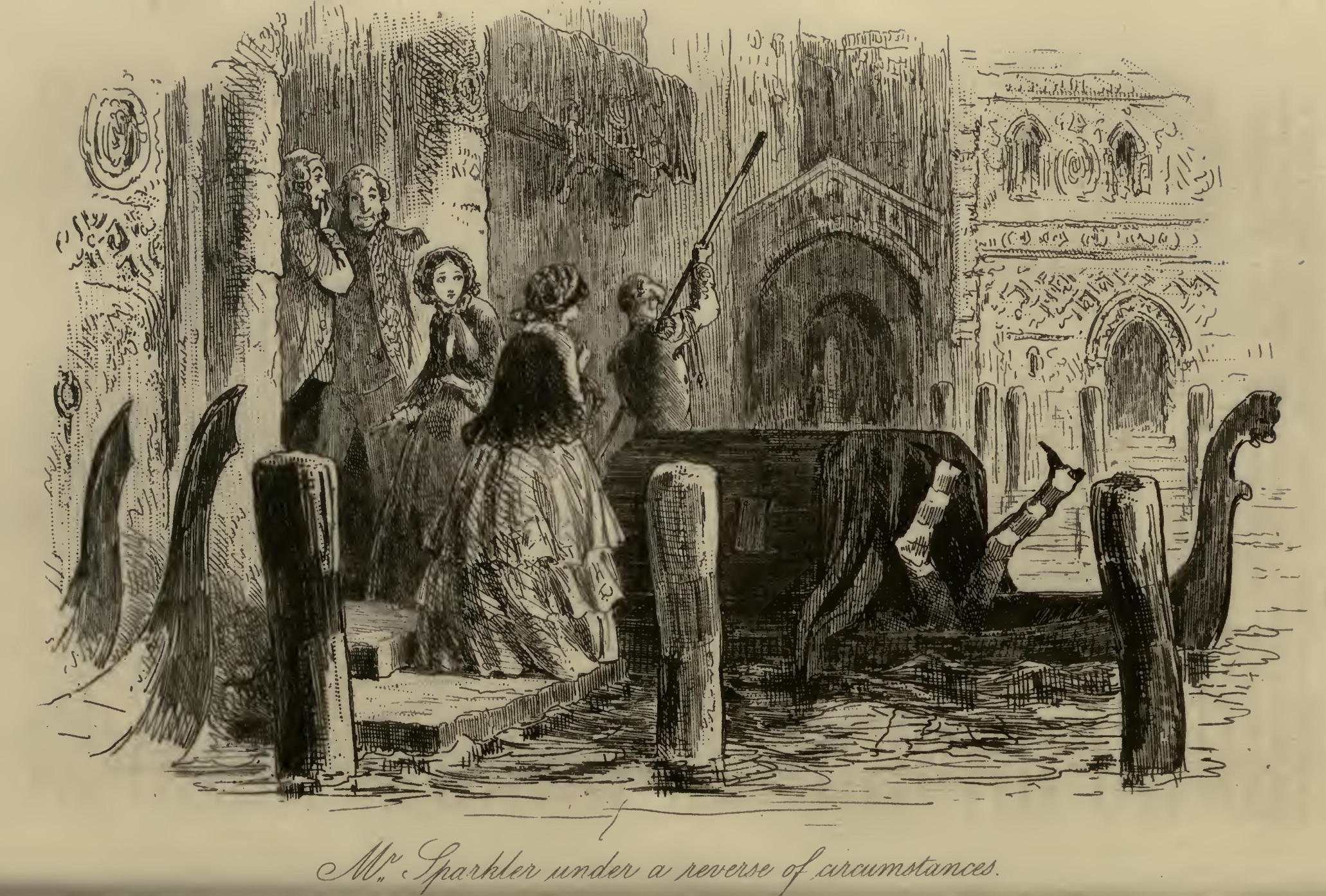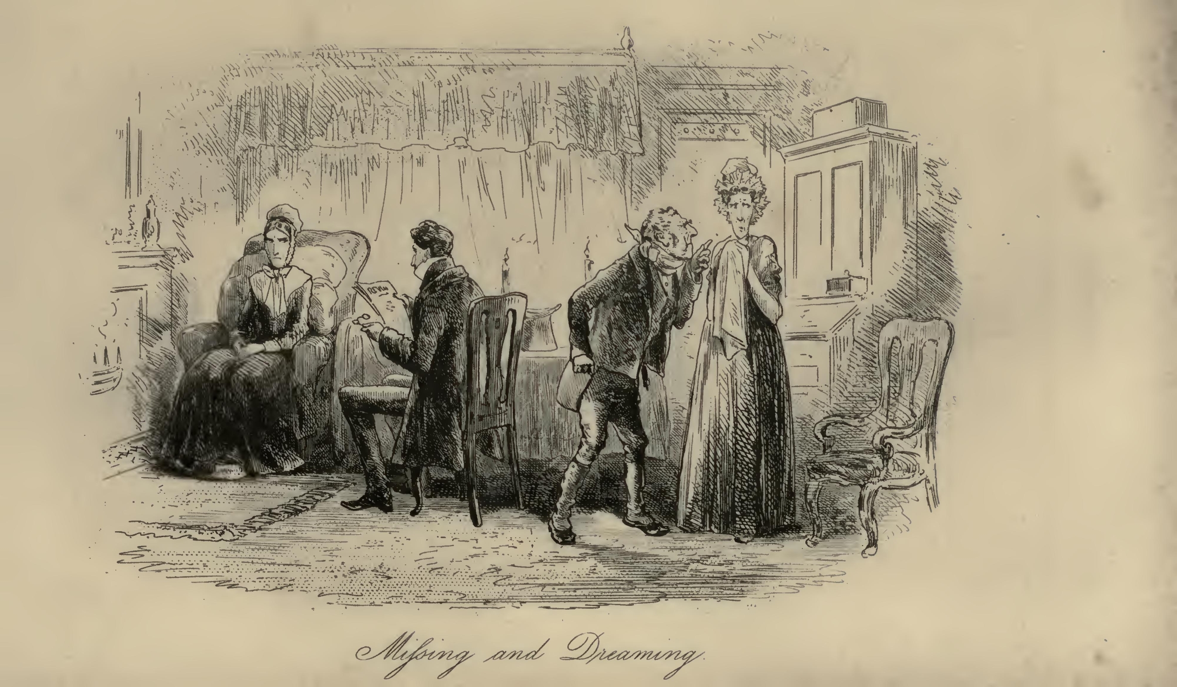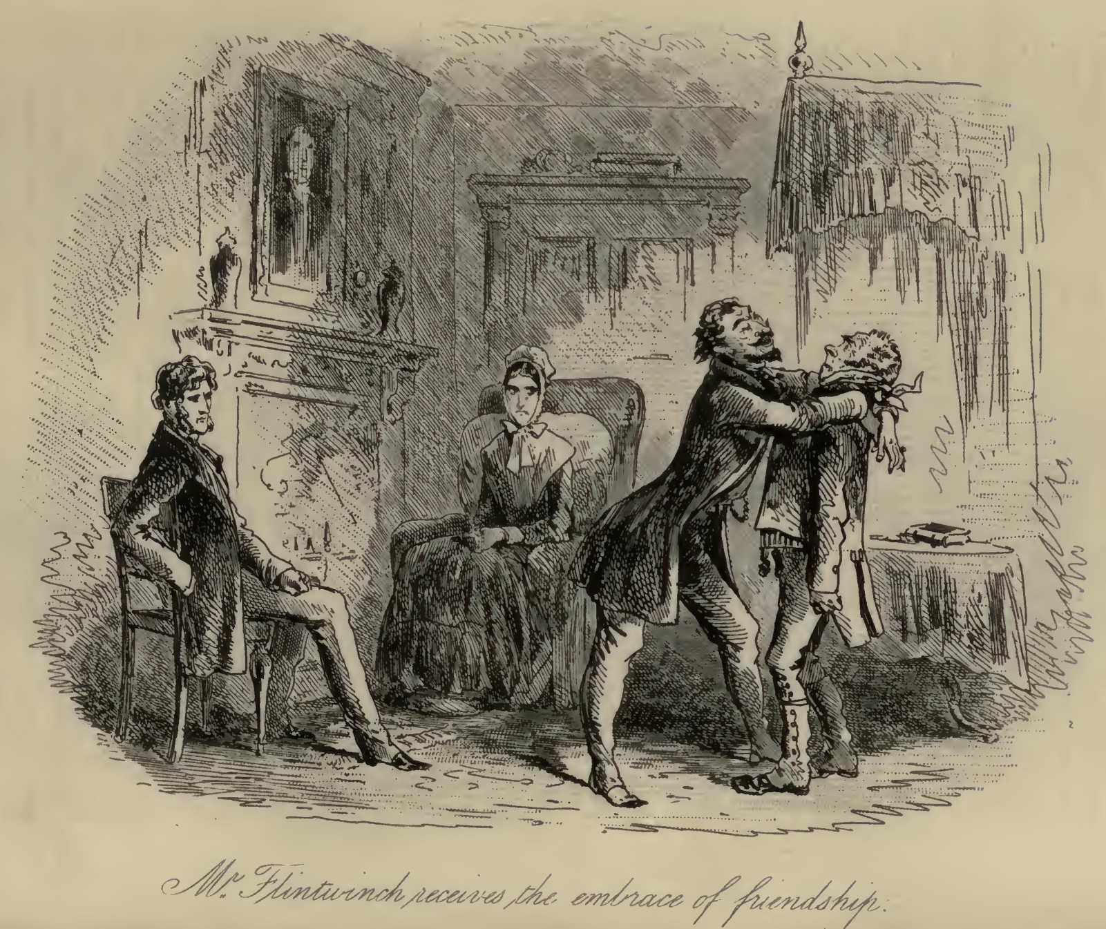 Flora’s eyes were a little red, and she seemed rather out of spirits. Mr F.‘s Aunt was so stiffened that she had the appearance of being past bending by any means short of powerful mechanical pressure. Her bonnet was cocked up behind in a terrific manner; and her stony reticule was as rigid as if it had been petrified by the Gorgon’s head, and had got it at that moment inside. With these imposing attributes, Mr F.‘s Aunt, publicly seated on the steps of the Marshal’s official residence, had been for the two or three hours in question a great boon to the younger inhabitants of the Borough, whose sallies of humour she had considerably flushed herself by resenting at the point of her umbrella, from time to time.