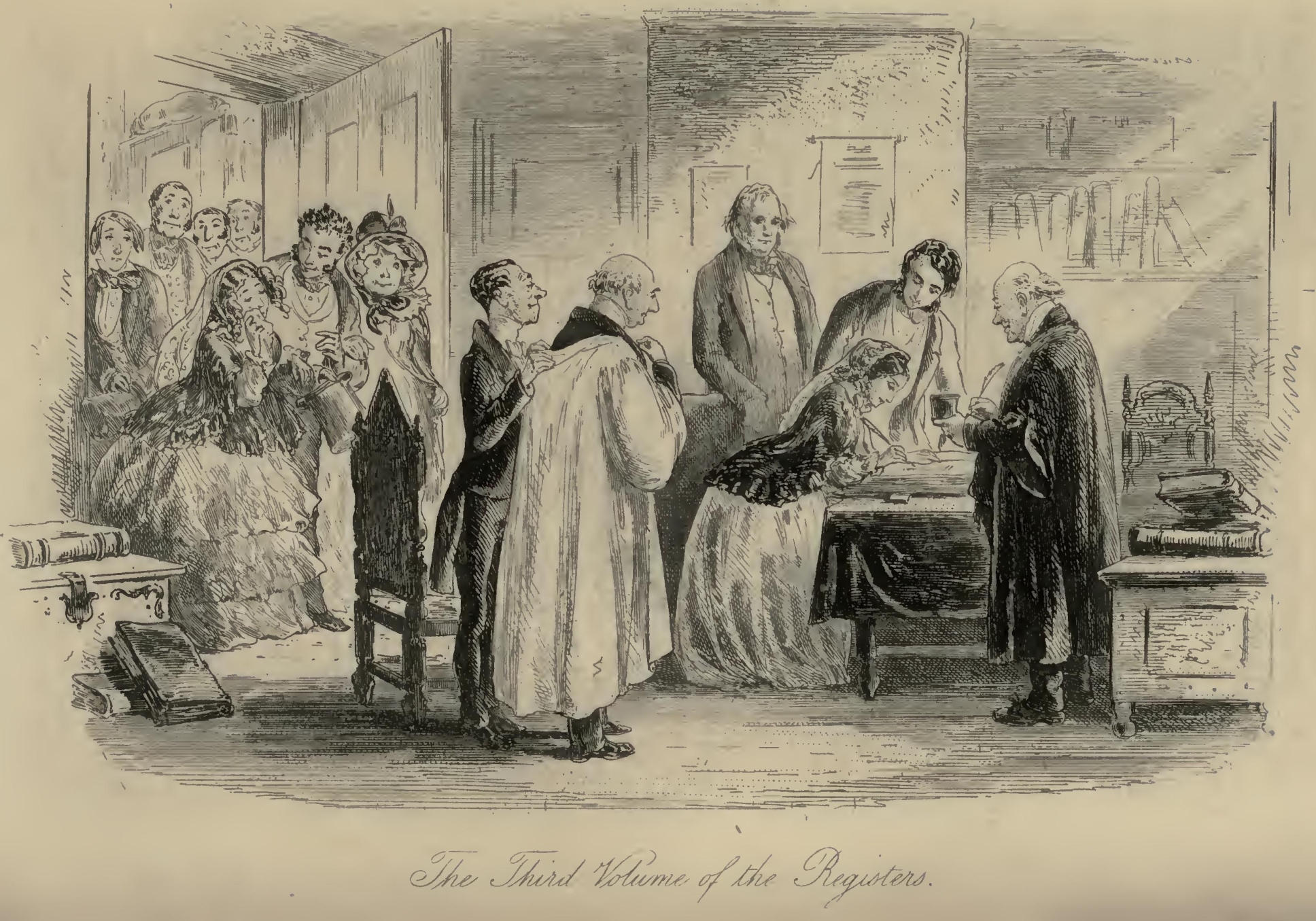 Little Dorrit’s old friend held the inkstand as she signed her name, and the clerk paused in taking off the good clergyman’s surplice, and all the witnesses looked on with special interest. ‘For, you see,’ said Little Dorrit’s old friend, ‘this young lady is one of our curiosities, and has come now to the third volume of our Registers. Her birth is in what I call the first volume; she lay asleep, on this very floor, with her pretty head on what I call the second volume; and she’s now a-writing her little name as a bride in what I call the third volume.’