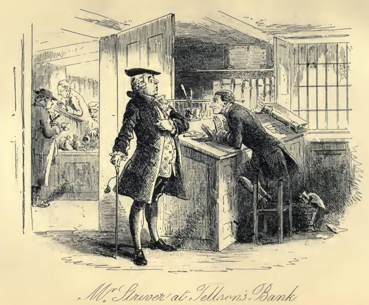 Tellson’s Bank had a run upon it in the mail. As the bank passenger—with an arm drawn through the leathern strap, which did what lay in it to keep him from pounding against the next passenger, and driving him into his corner, whenever the coach got a special jolt—nodded in his place, with half-shut eyes, the little coach-windows, and the coach-lamp dimly gleaming through them, and the bulky bundle of opposite passenger, became the bank, and did a great stroke of business. The rattle of the harness was the chink of money, and more drafts were honoured in five minutes than even Tellson’s, with all its foreign and home connection, ever paid in thrice the time. Then the strong-rooms underground, at Tellson’s, with such of their valuable stores and secrets as were known to the passenger (and it was not a little that he knew about them), opened before him, and he went in among them with the great keys and the feebly-burning candle, and found them safe, and strong, and sound, and still, just as he had last seen them.