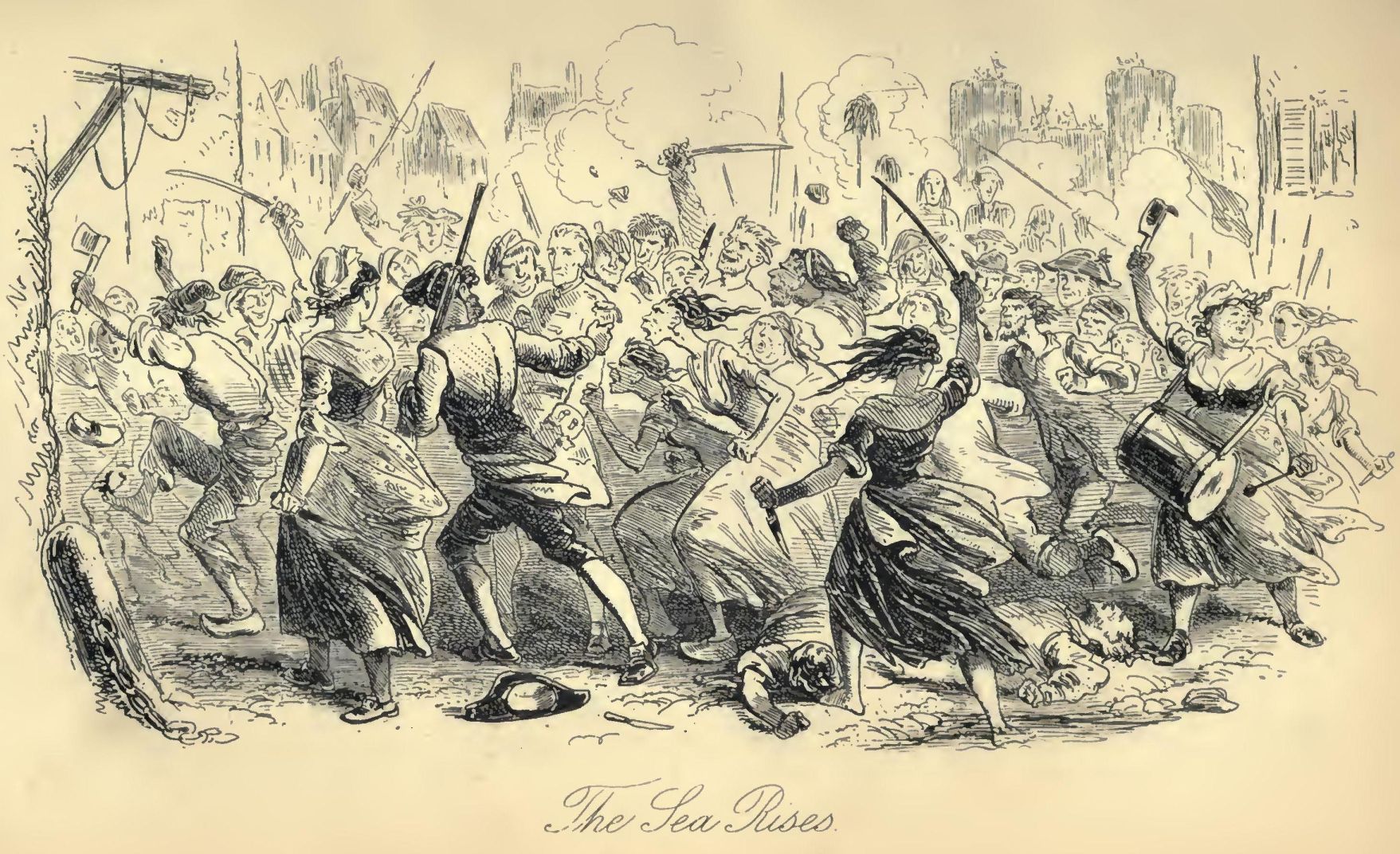 The clocks are on the stroke of three, and the furrow ploughed among the populace is turning round, to come on into the place of execution, and end. The ridges thrown to this side and to that, now crumble in and close behind the last plough as it passes on, for all are following to the Guillotine. In front of it, seated in chairs, as in a garden of public diversion, are a number of women, busily knitting. On one of the fore-most chairs, stands The Vengeance, looking about for her friend.