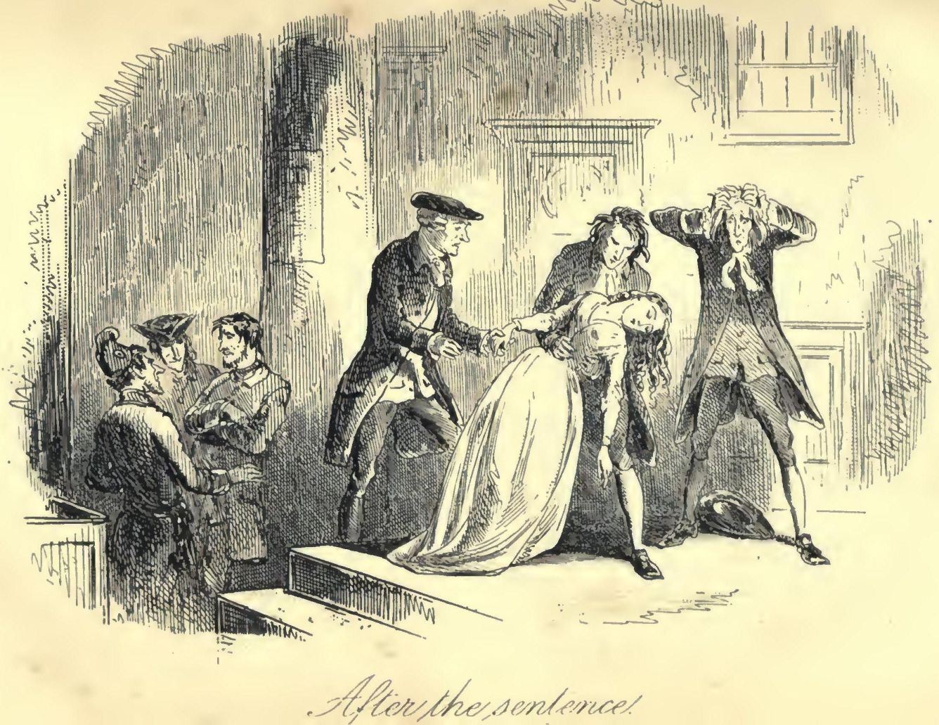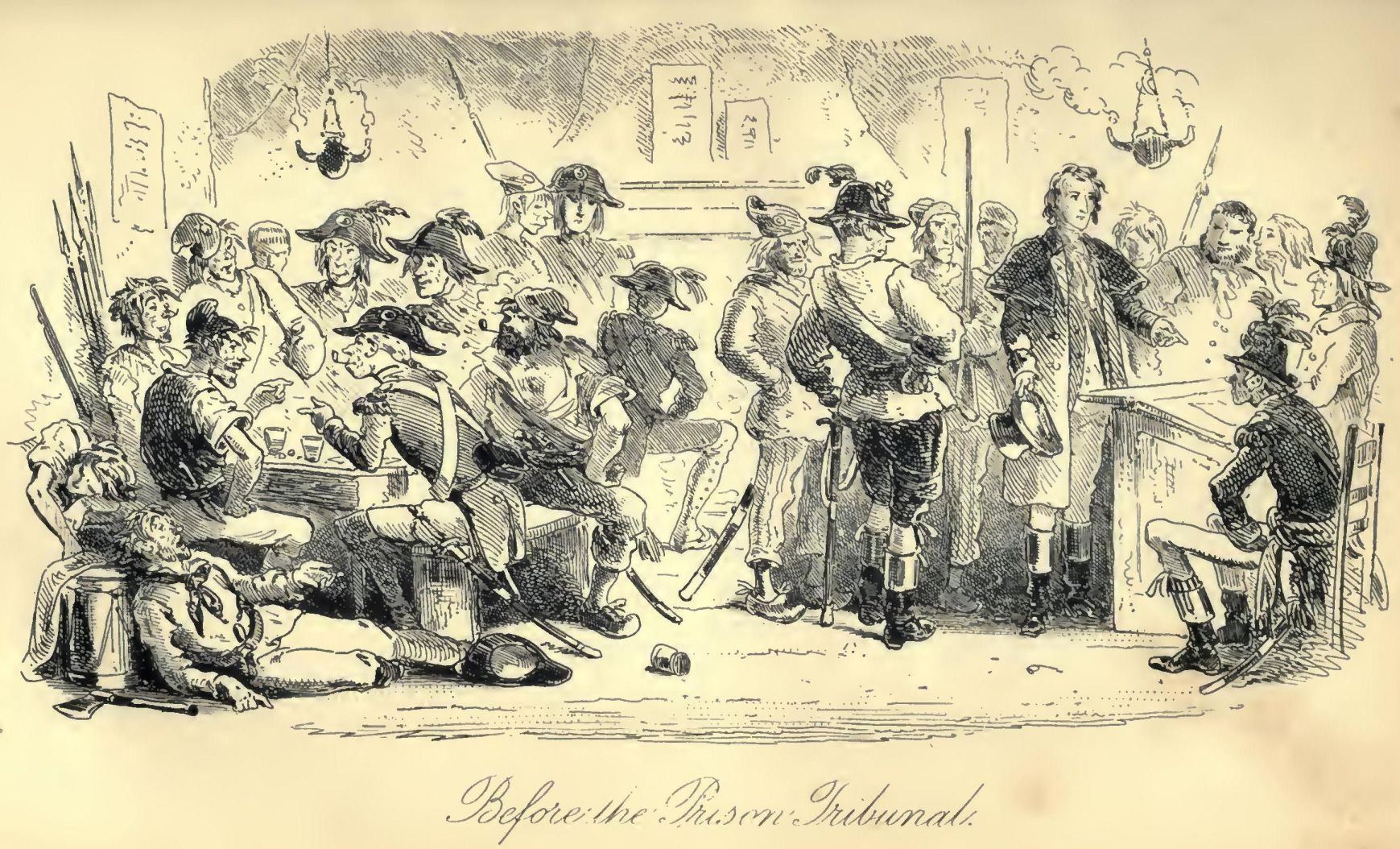 Of the riders in the tumbrils, some observe these things, and all things on their last roadside, with an impassive stare; others, with a lingering interest in the ways of life and men. Some, seated with drooping heads, are sunk in silent despair; again, there are some so heedful of their looks that they cast upon the multitude such glances as they have seen in theatres, and in pictures. Several close their eyes, and think, or try to get their straying thoughts together. Only one, and he a miserable creature, of a crazed aspect, is so shattered and made drunk by horror, that he sings, and tries to dance. Not one of the whole number appeals by look or gesture, to the pity of the people.